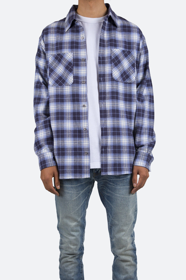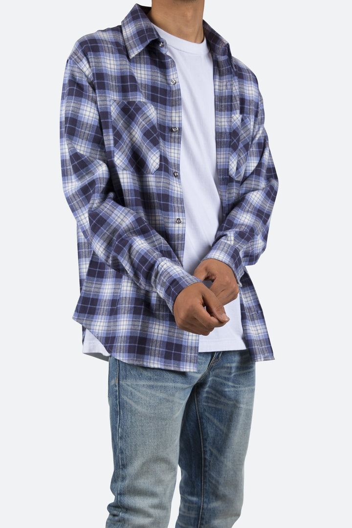 the Metal Button Flannel is designed with a relaxed fit, a scoop hemline, pleats at the wrist, an adjustable button closure, slits at the side seam, all in a cotton plaid woven fabric, and finished with metal buttons.