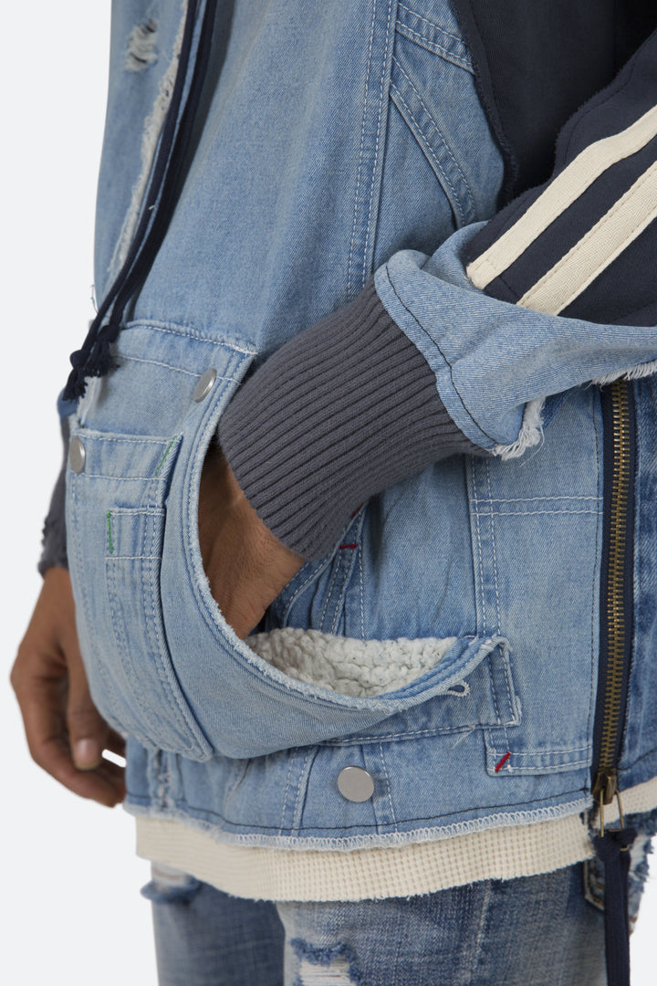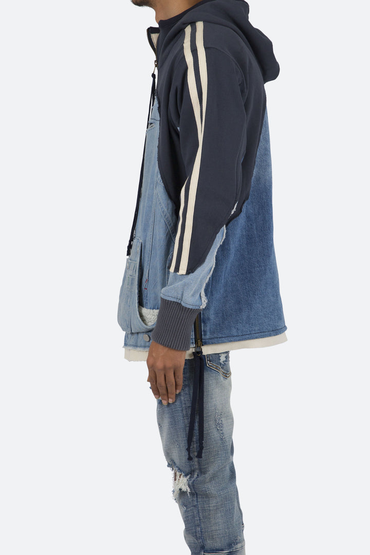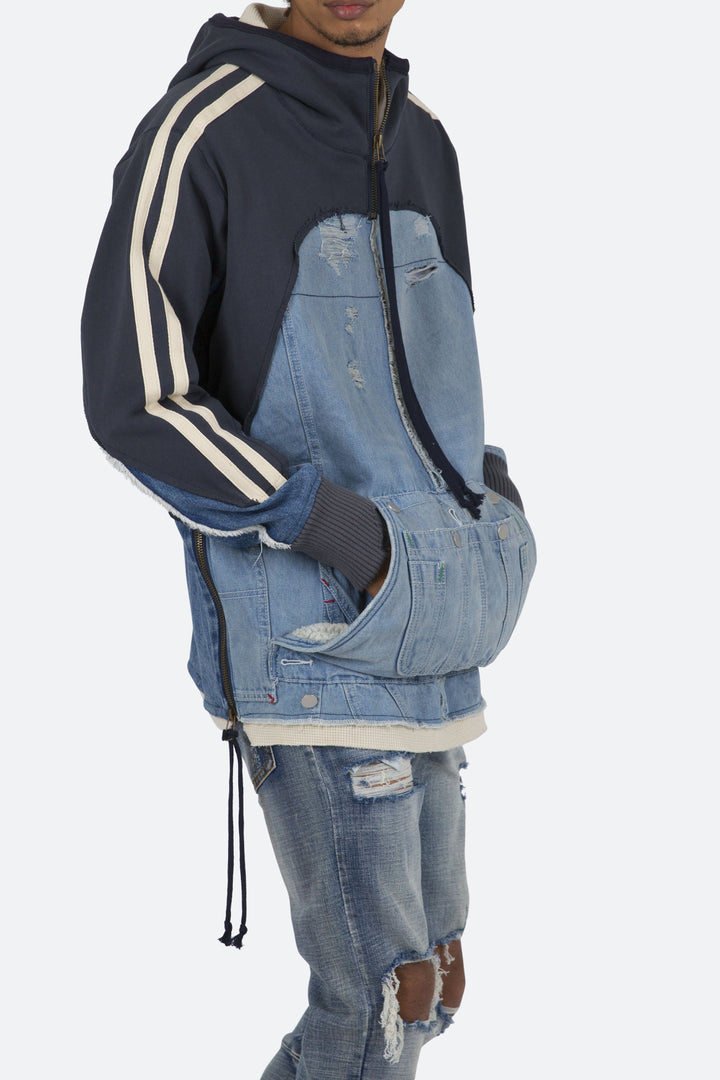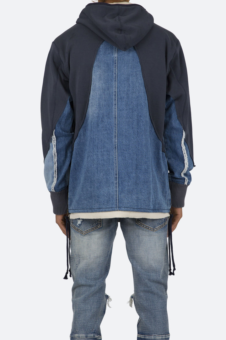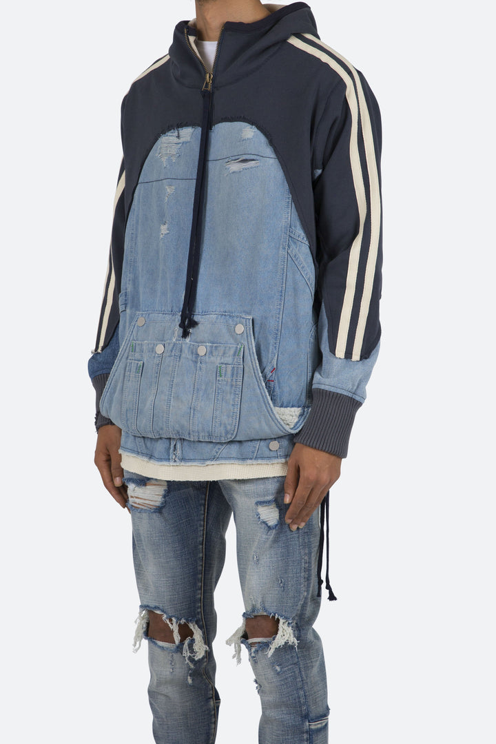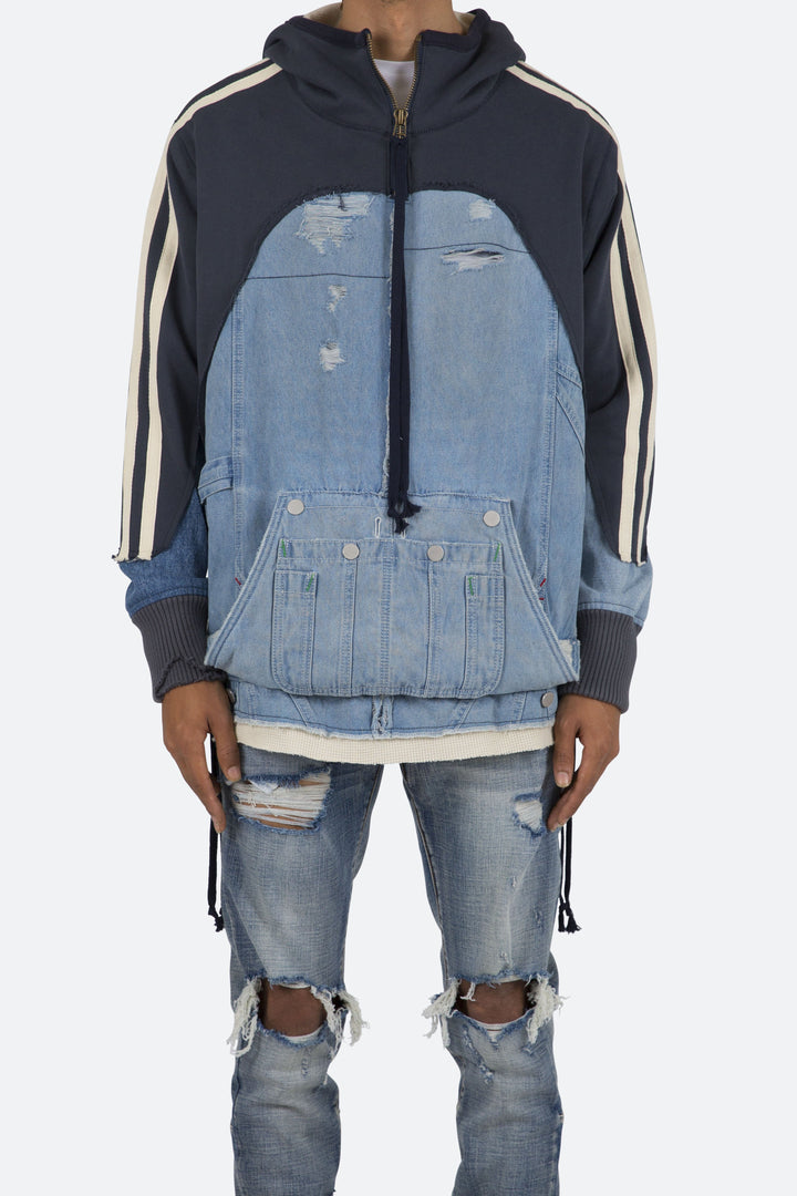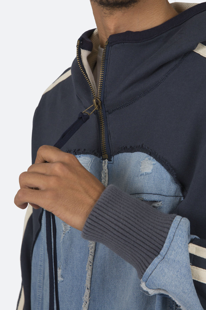 the Mixed Material Pullover is designed with a relaxed fit and features denim and terry panelling with contrast striping down the sleeve, a zipper placket, kangaroo pocket at the front, ribbing at the wrist and waist, and finished with cotton pull cord on the zipper.