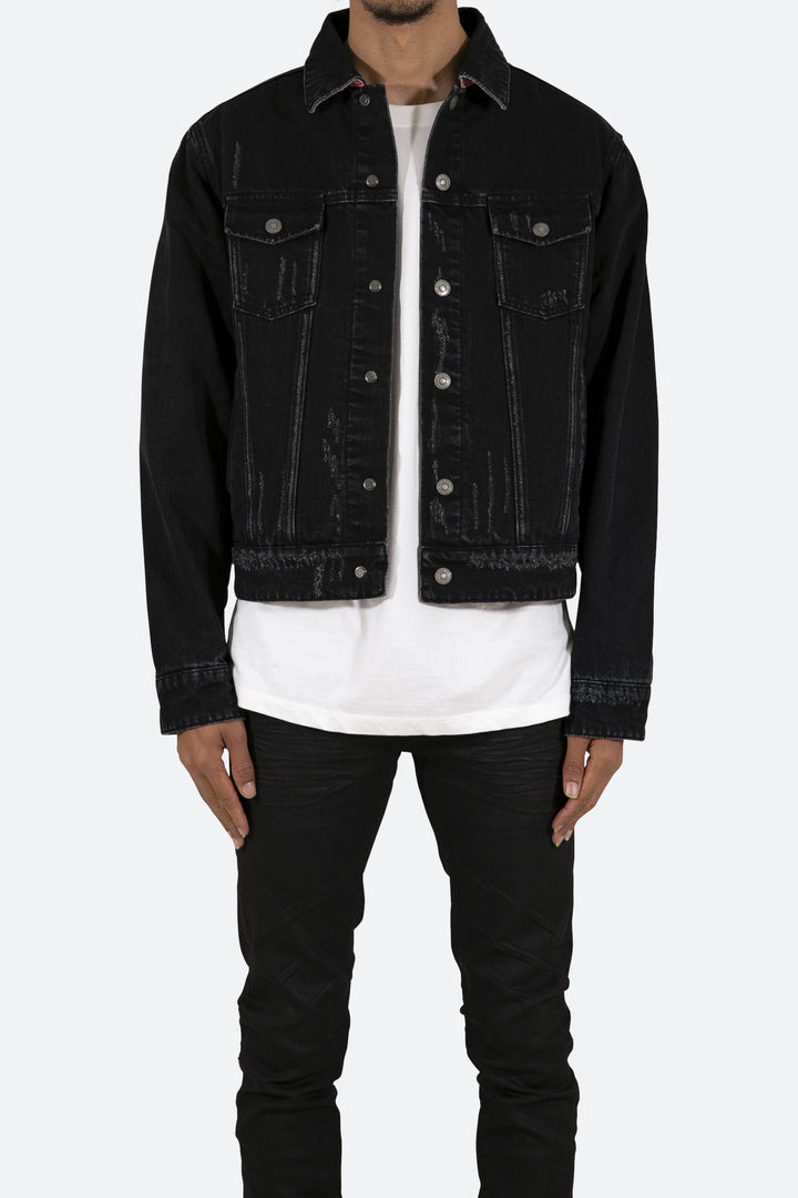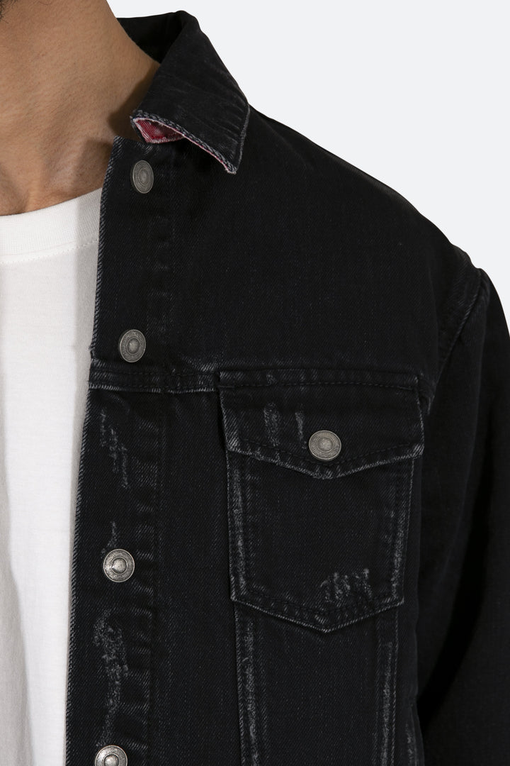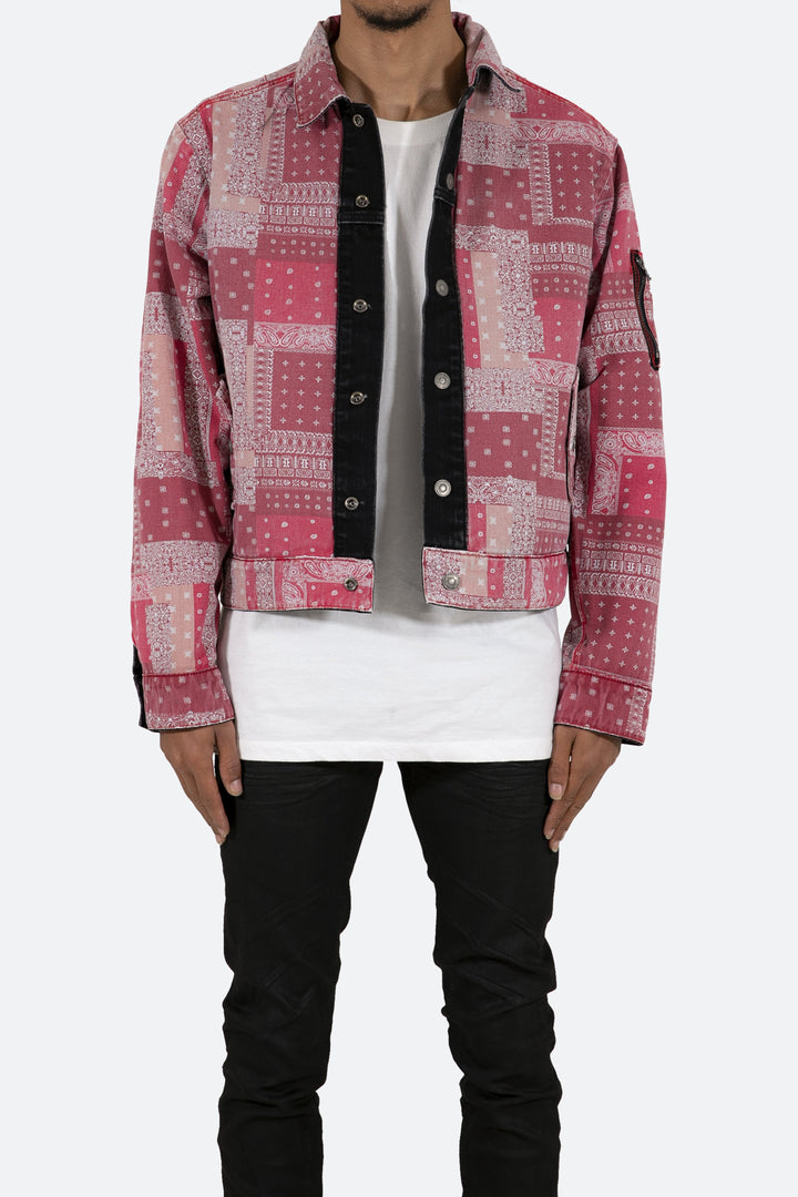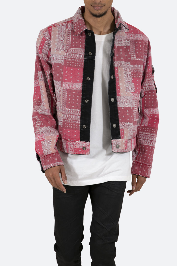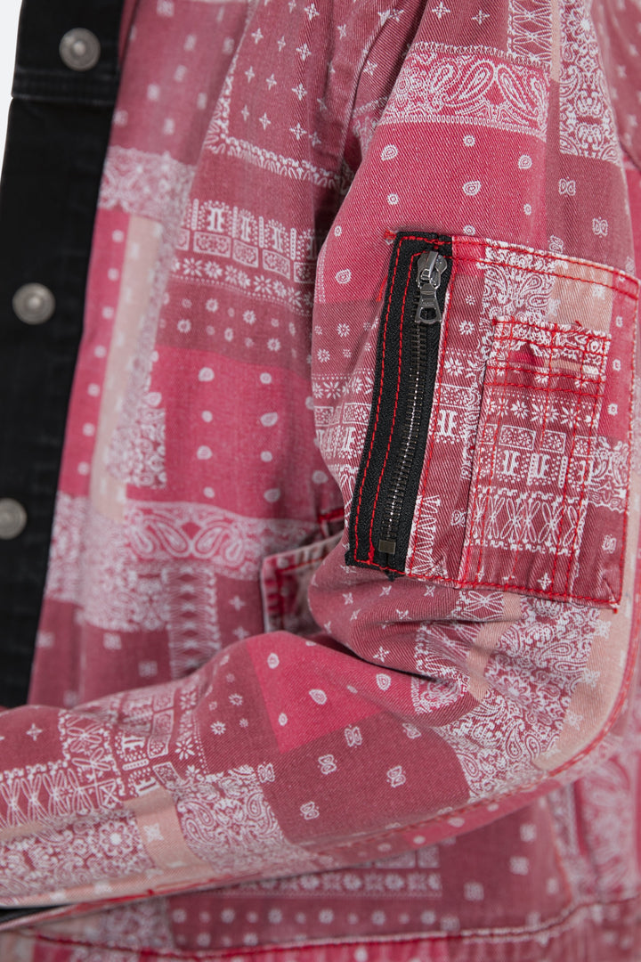 the Reversible Paisley Trucker Jacket is designed with a classic fit and features traditional trucker details with light distressing on the denim shell, and finished with a patchwork paisley lining fabric and zipper pocket on the wearer’s right arm.