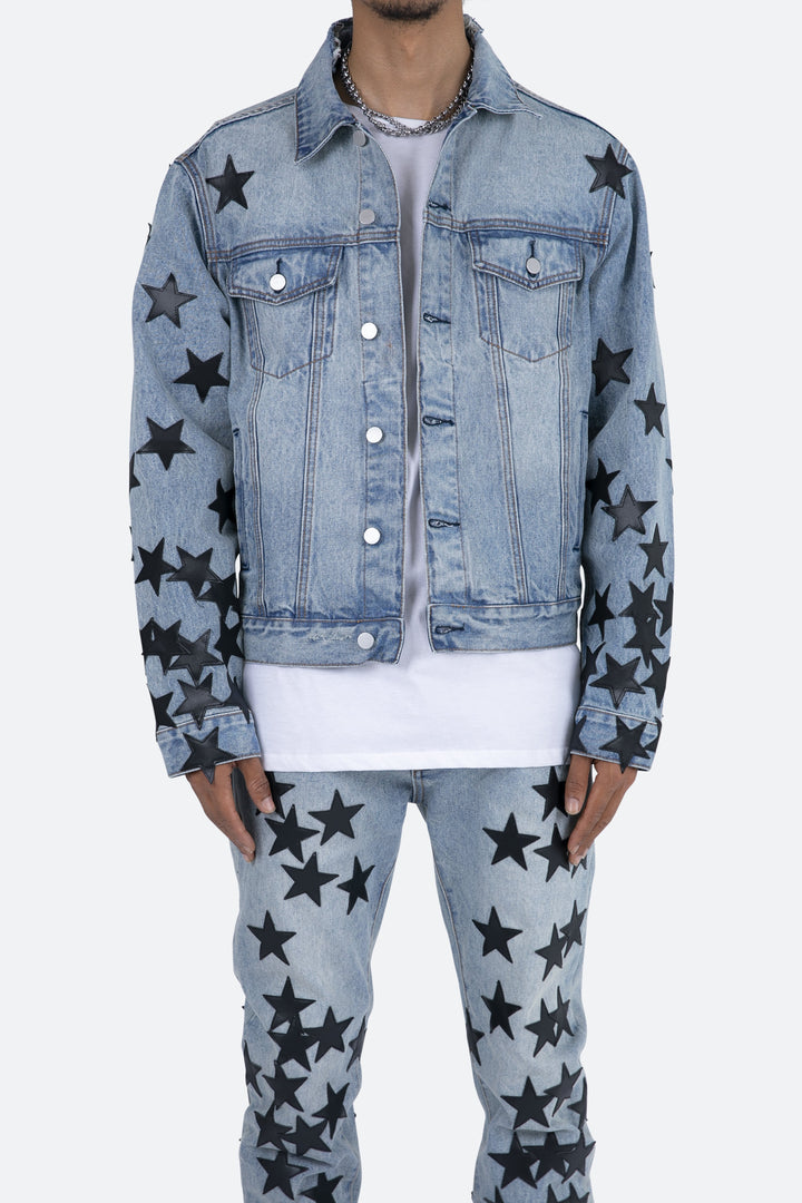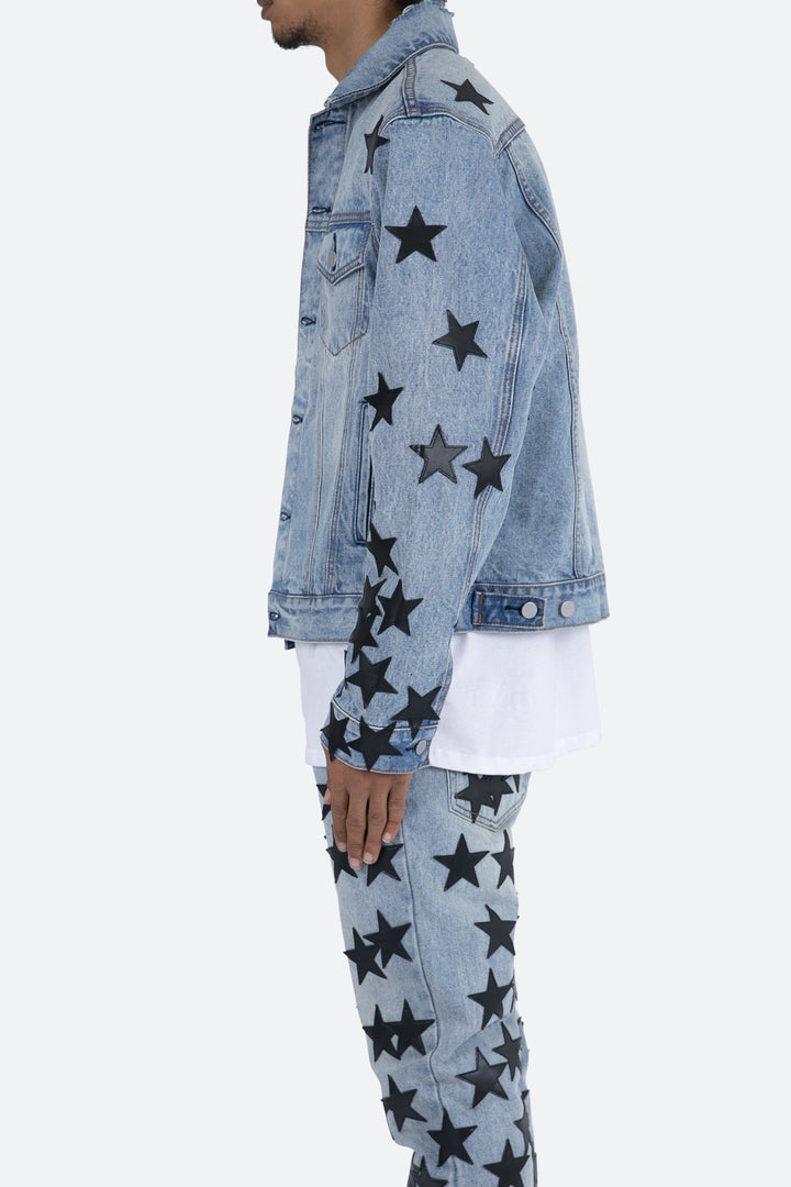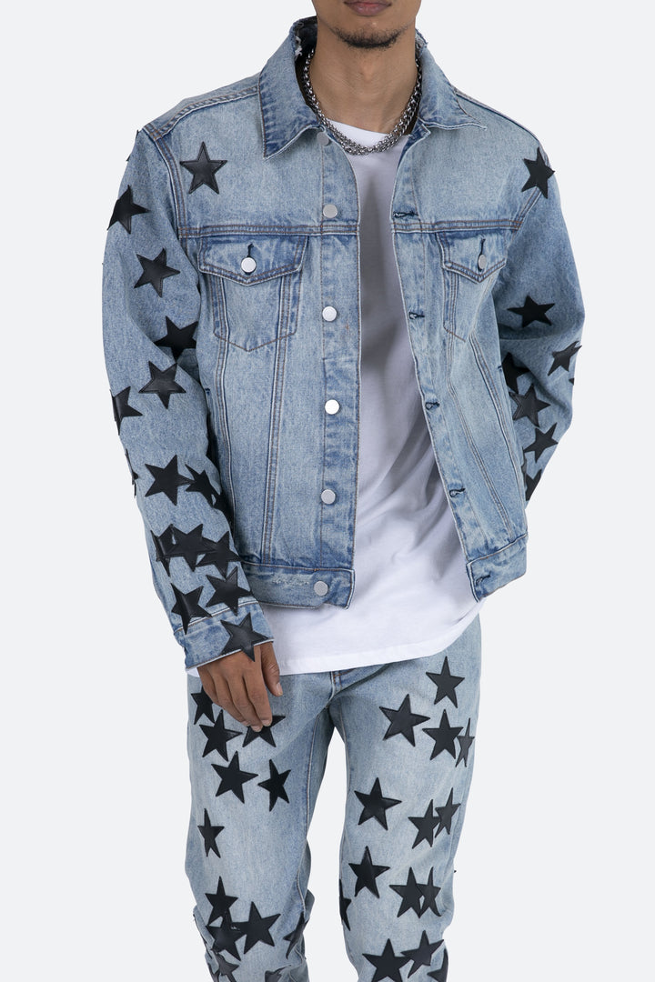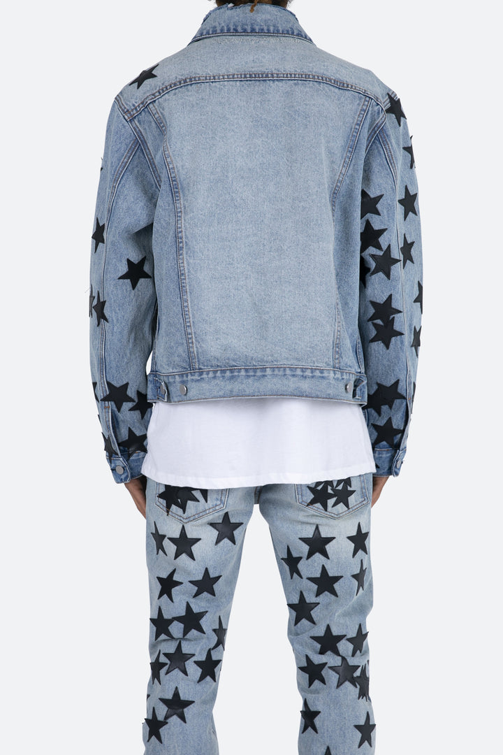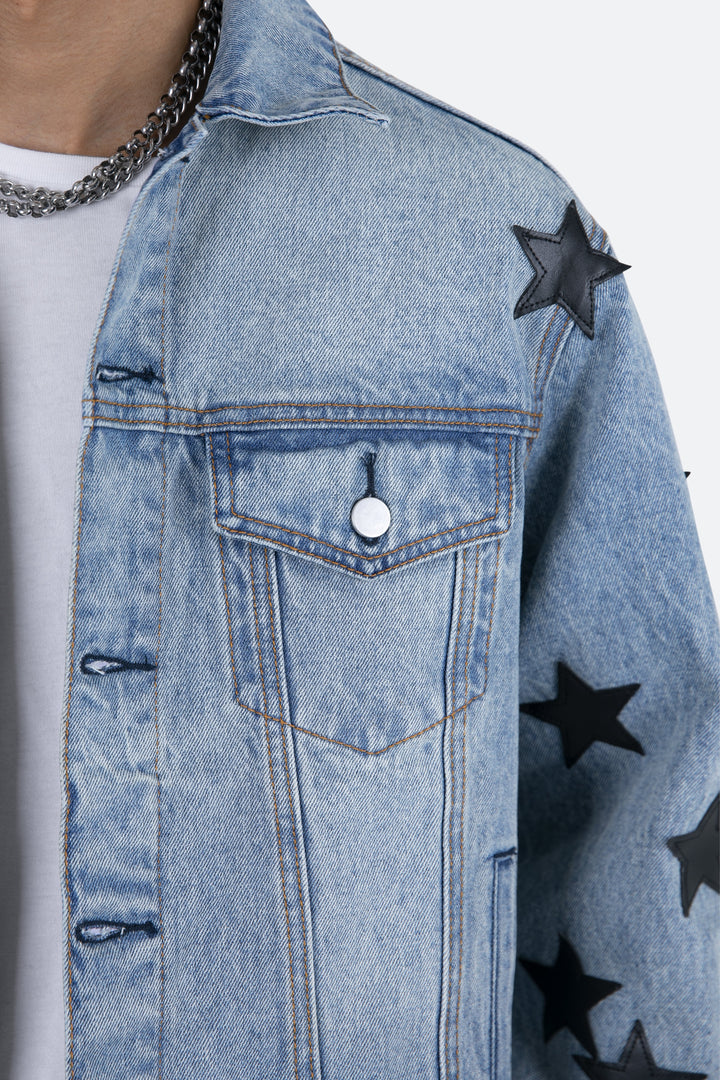 the Star Trucker is designed with a relaxed fit and features a classic cut and details, vegan leather star patches attached at the sleeves and wrists, and finished in a light wash blue denim.