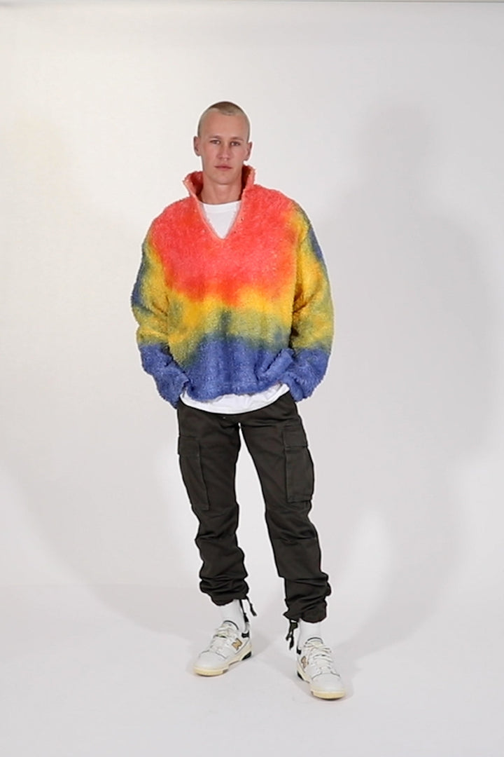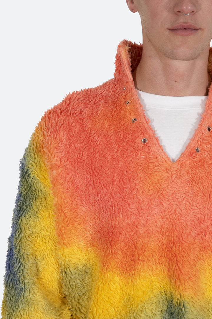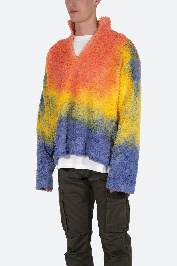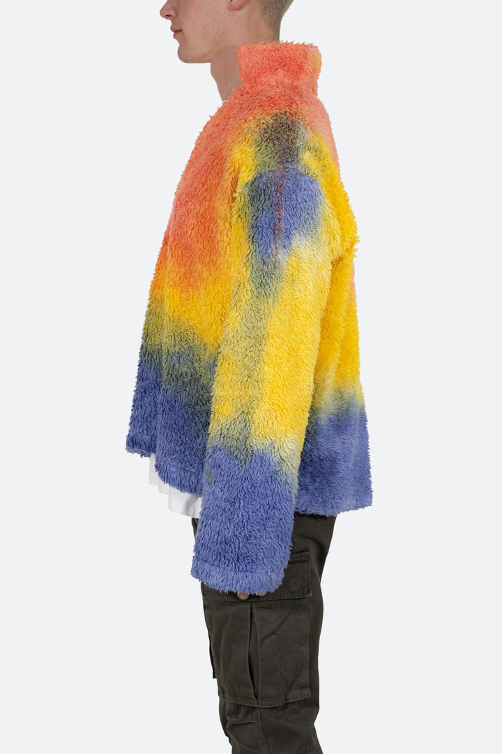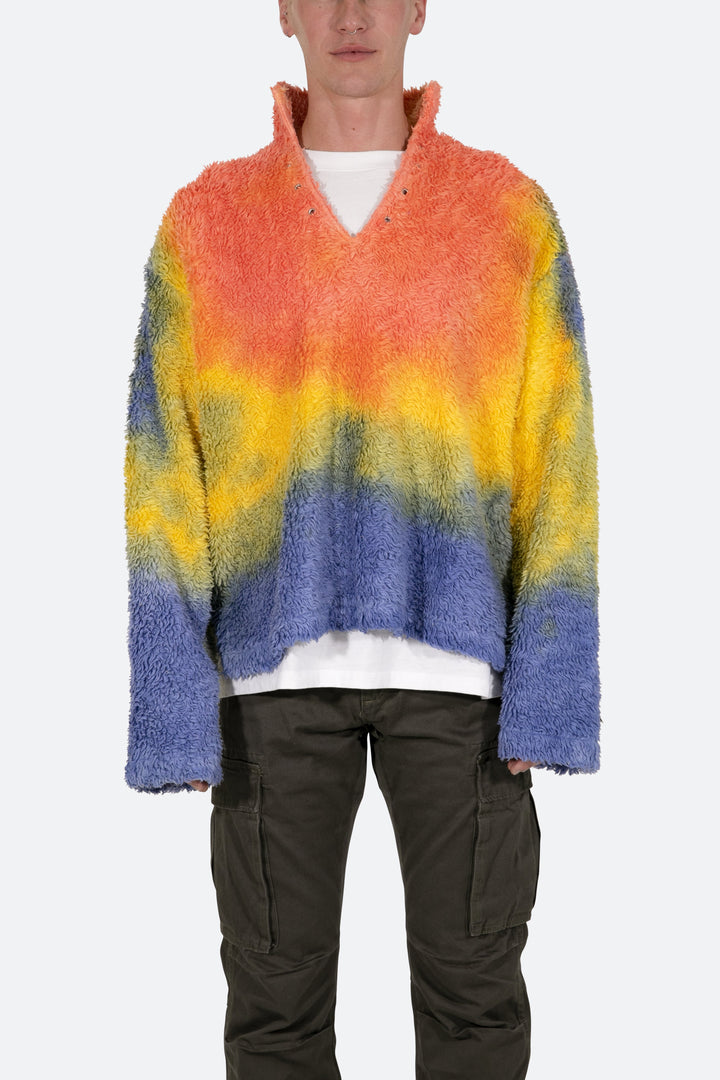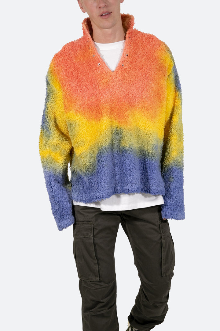 the Tie Dye Sherpa Pullover is designed with a relaxed fit, an open placket, standing collar, and constructed from a custom dyed sherpa fabric.