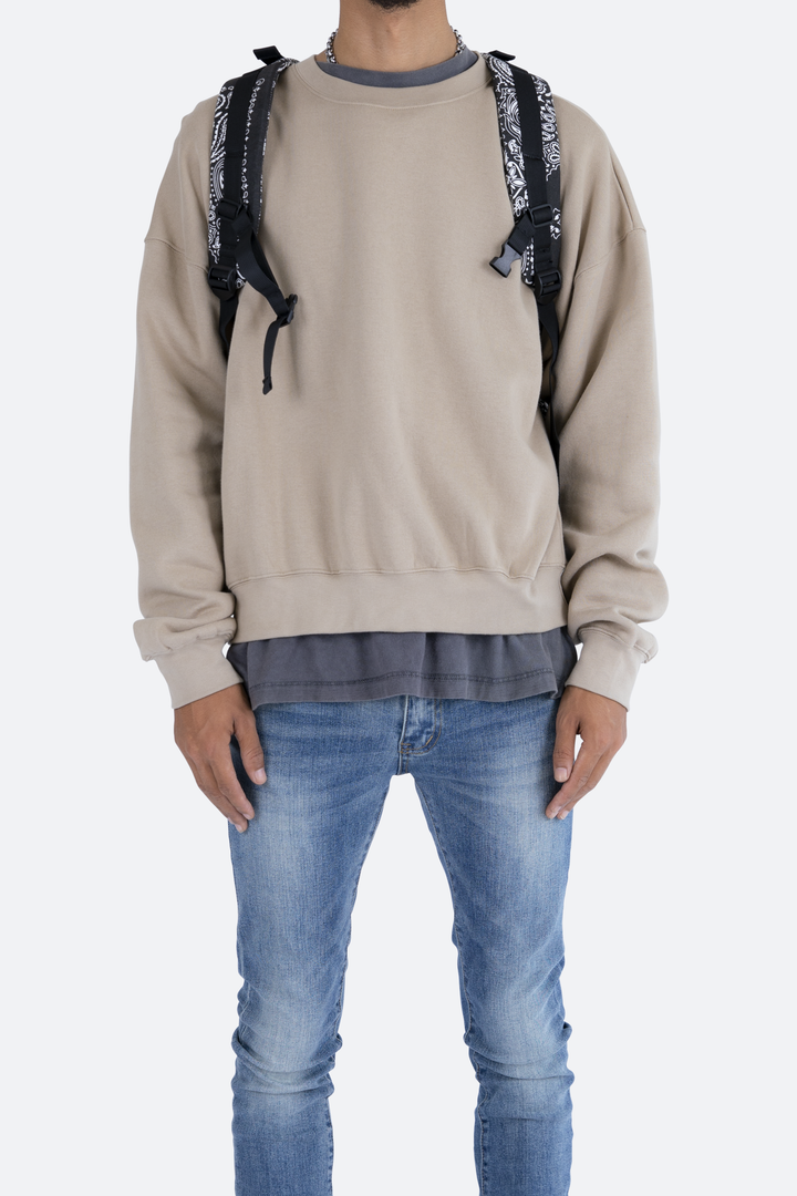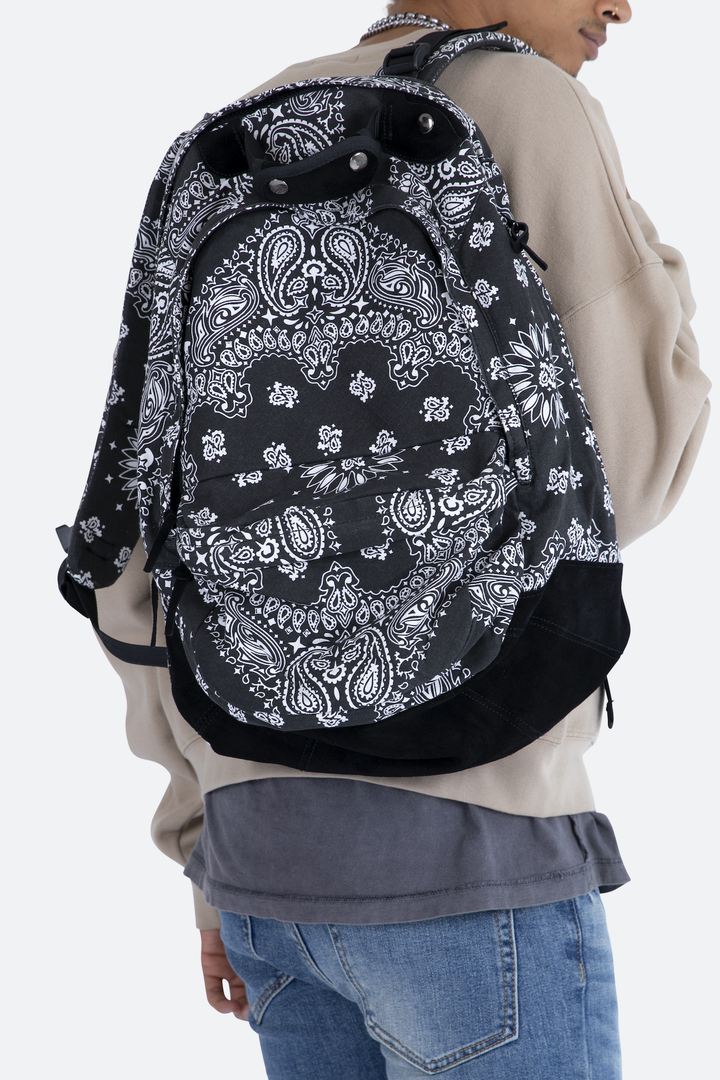 the Paisley Backpack is constructed from paisley printed cotton twill and features one large compartment that is closed with a zipper and contains a laptop compartment, smaller pocket on the front, snap on nylon webbing across the chest, and is finished with leather trims on the handle and bottom for an extended life.