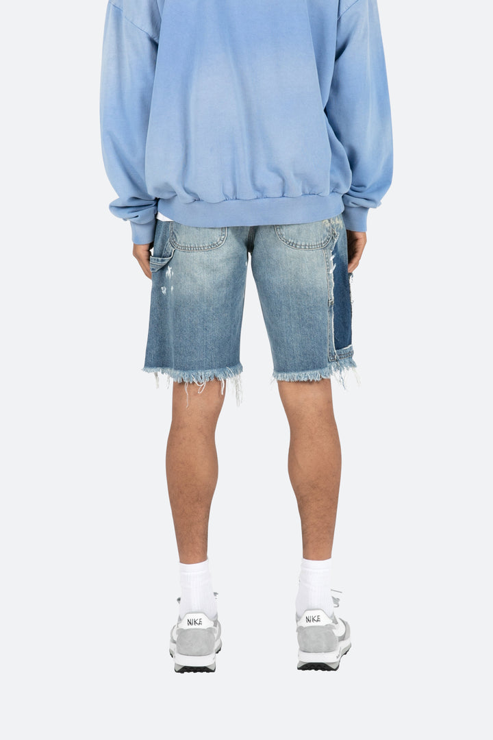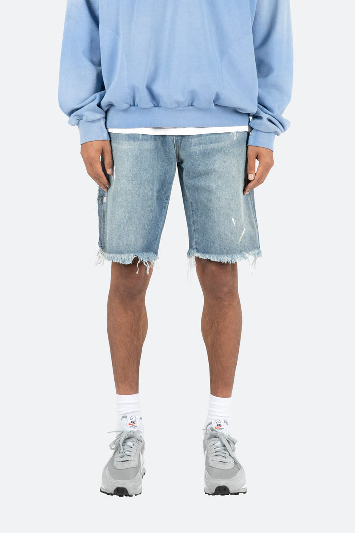 the R463 Denim Shorts are designed with a relaxed fit throughout, featuring paint details throughout, panel witness mark on the wearer’s right hip, hanger loop on the wearer’s left hip, and finished with a raw hem.