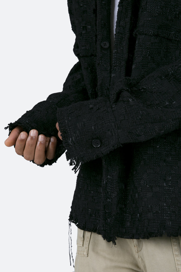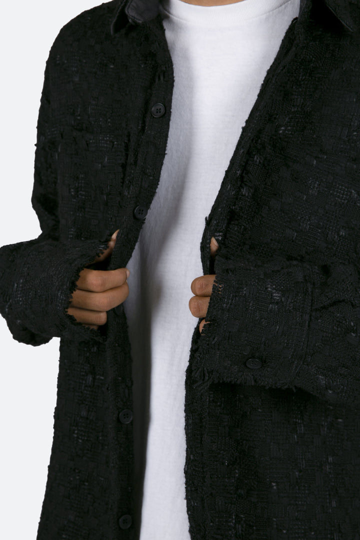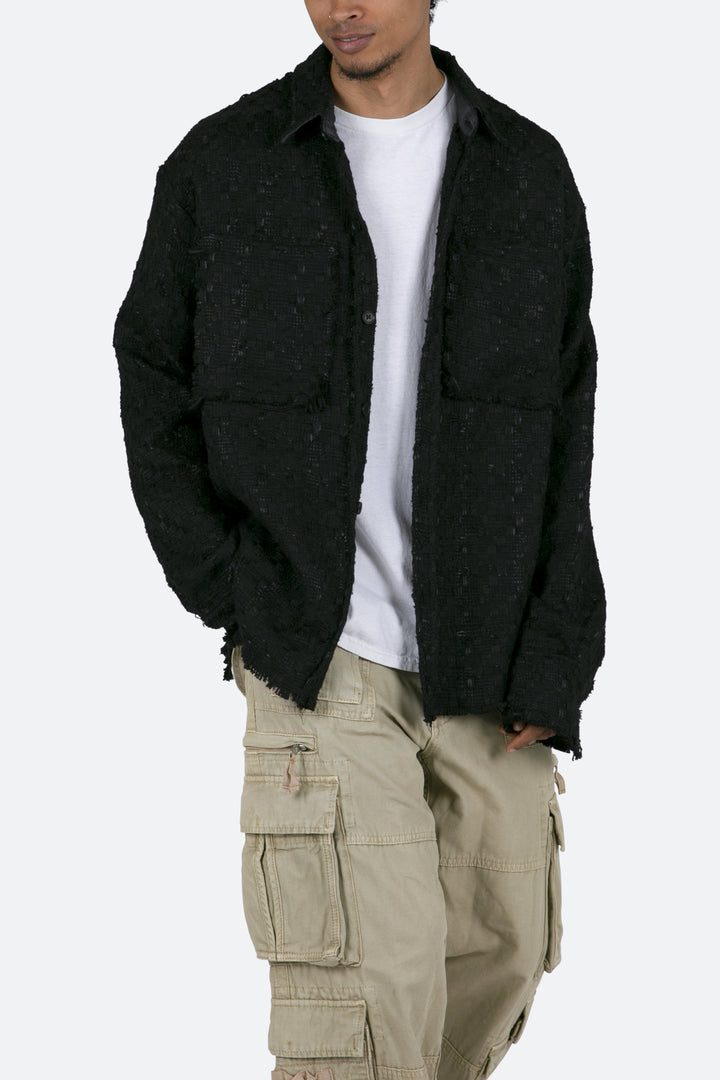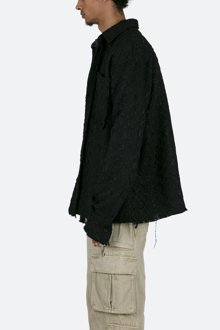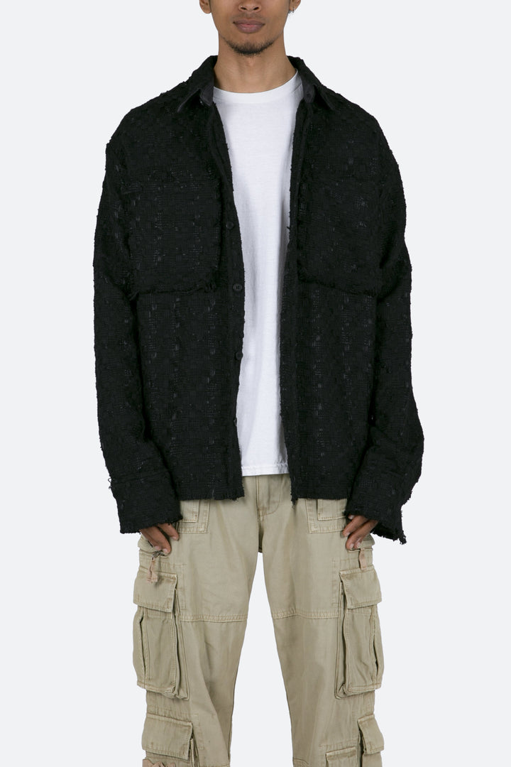 the Raw Edge Flannel Shirt is designed with an oversized fit and raw edges at the sleeves, waist, and pockets, all constructed from a loose weave custom polyester flannel fabric.