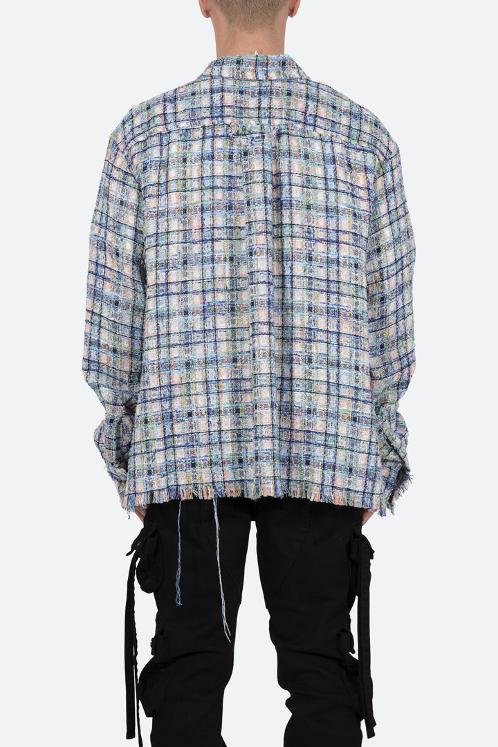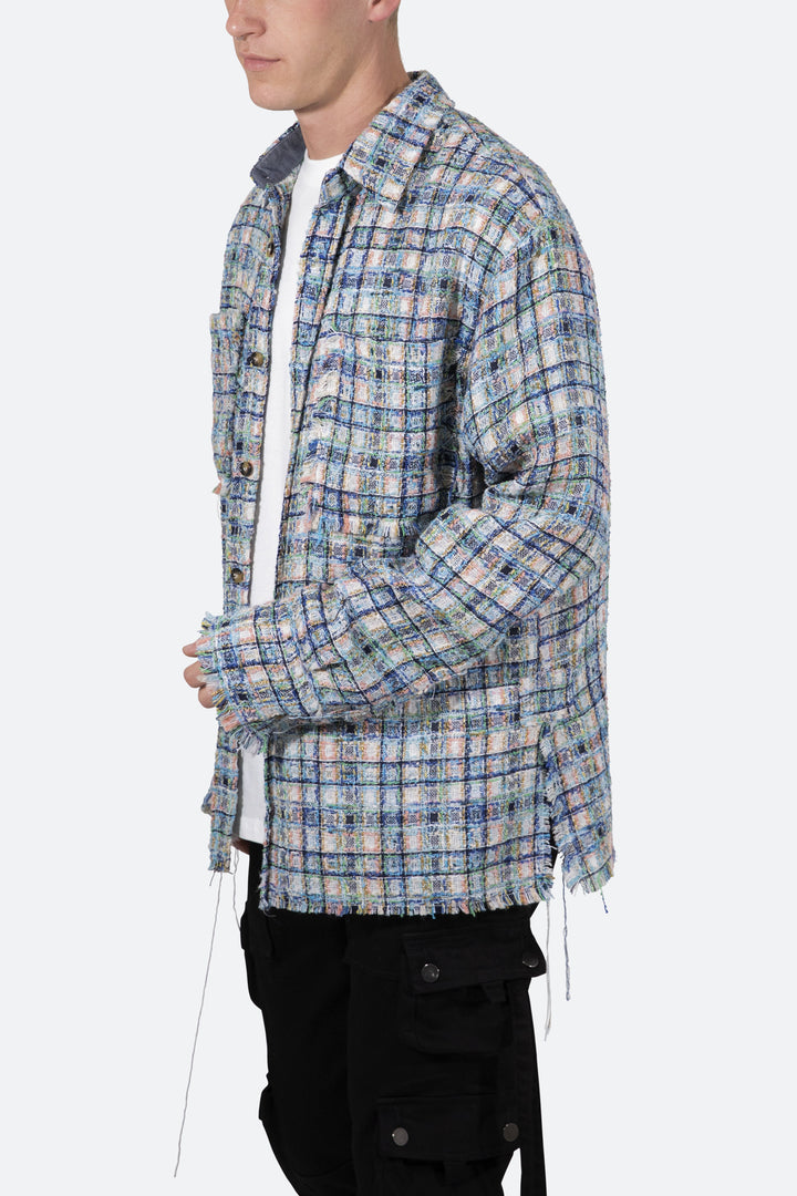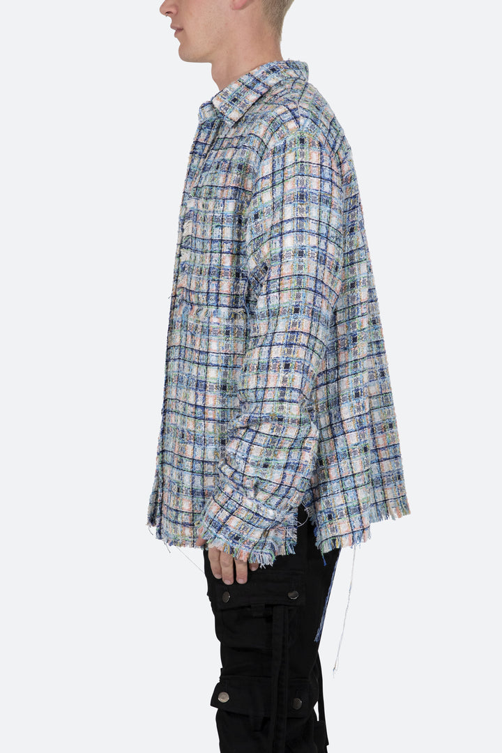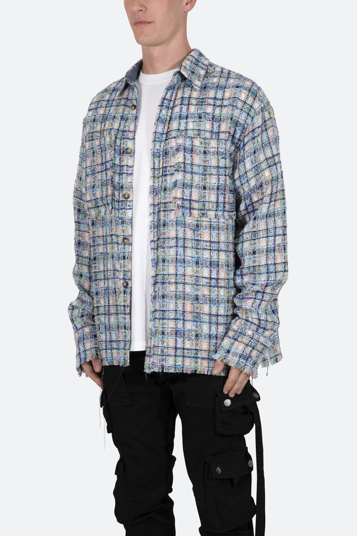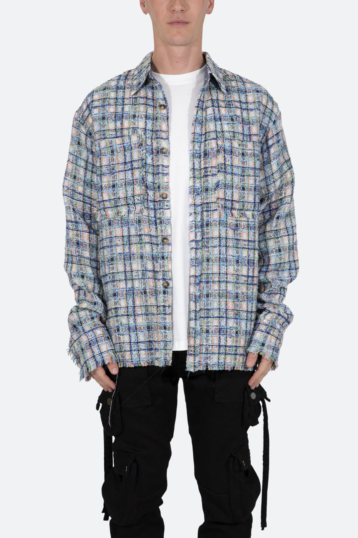 the Raw Edge Flannel Shirt is designed with an oversized fit and raw edges at the sleeves, waist, and pockets, all constructed from a loose weave custom polyester flannel fabric.