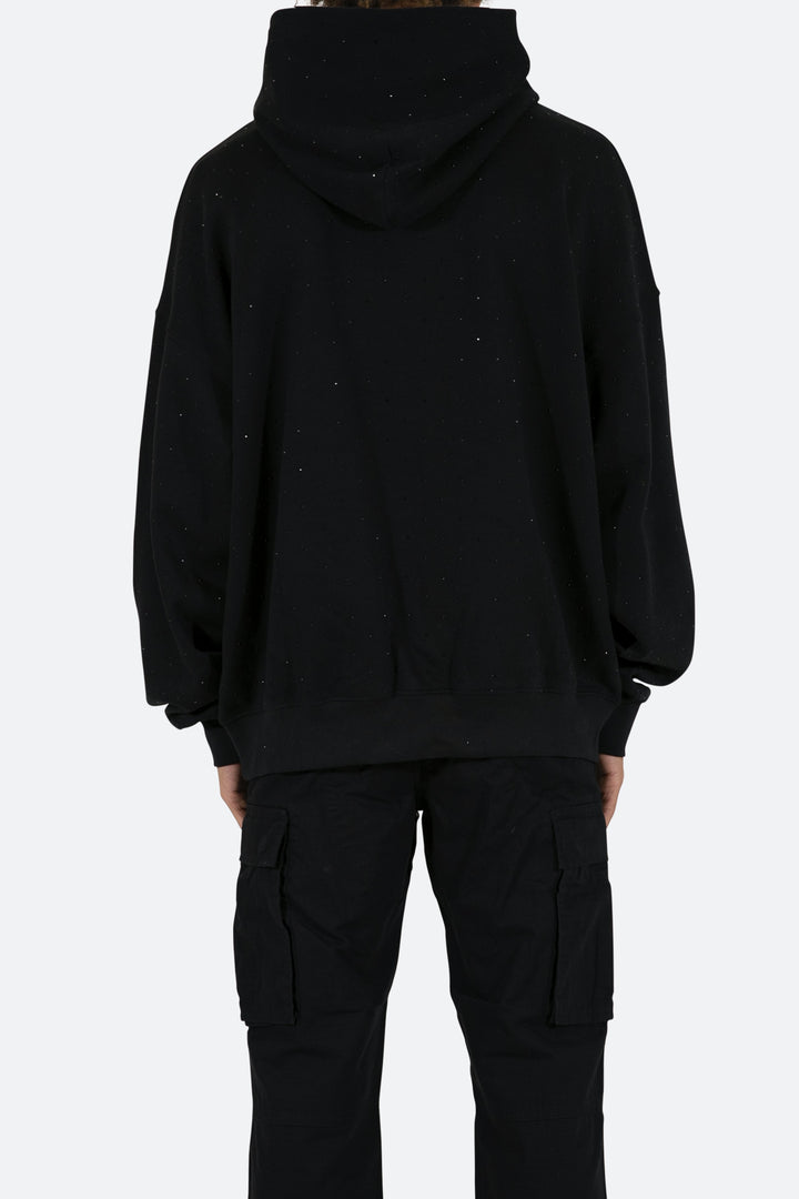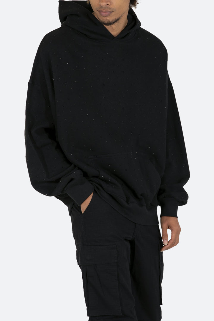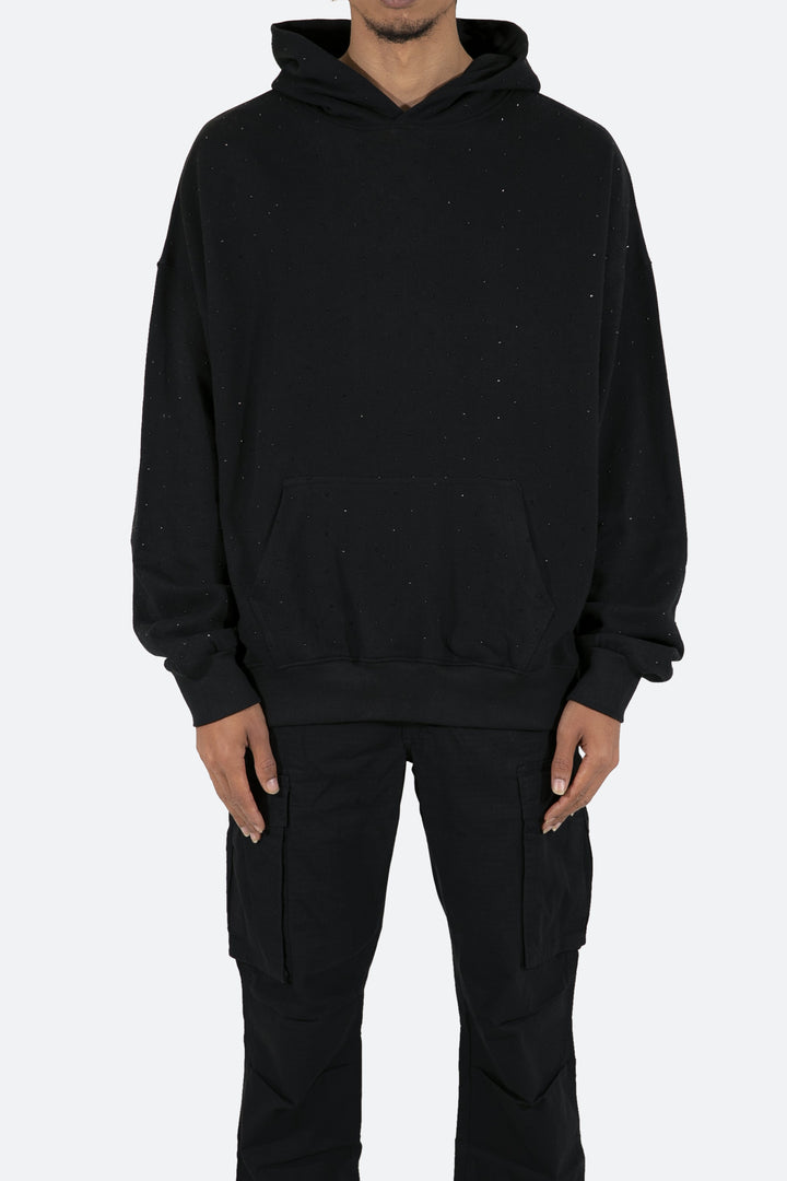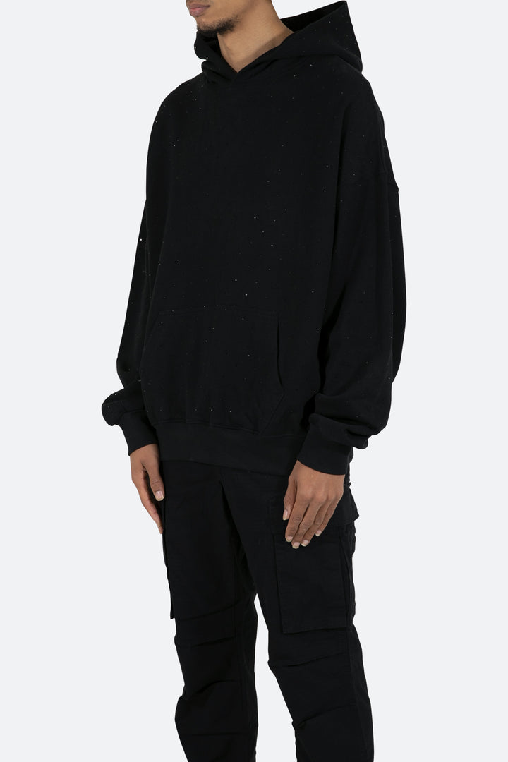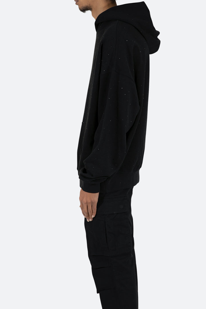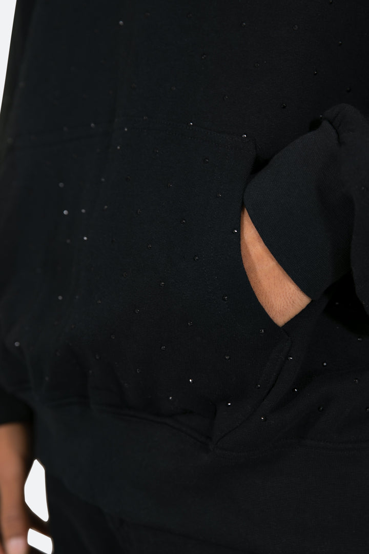 The Rhinestone Hoodie features a relaxed fit with a dropped shoulder design, front pouch pocket, ribbing at the wrists and waist, constructed from a washed and brushed fleece fabric, and finished with tonal rhinestones throughout.