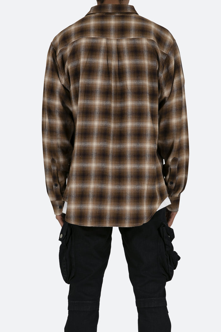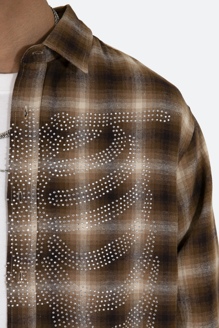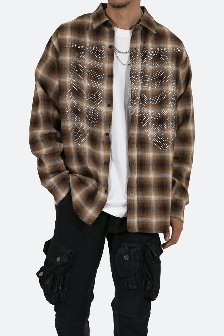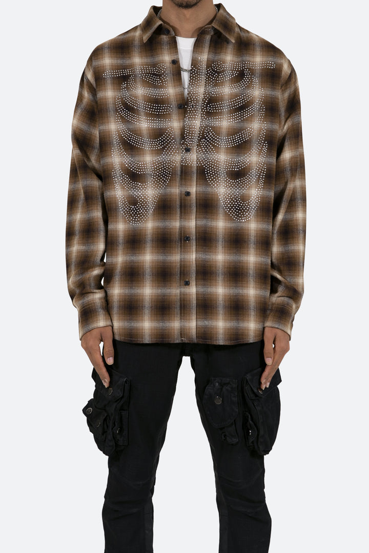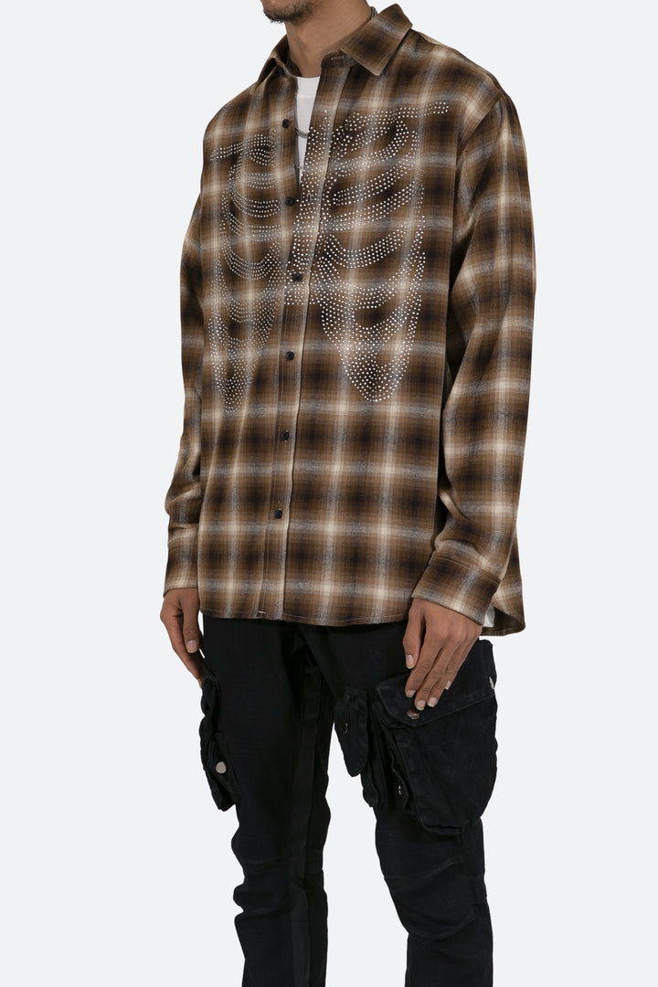 the Rhinestone Skeleton Flannel Shirt is designed with a relaxed fit, a scoop hemline, pleats at the wrist, an adjustable button closure, slits at the side seam, all in a cotton plaid woven fabric, and finished with skeleton artwork from rhinestones.