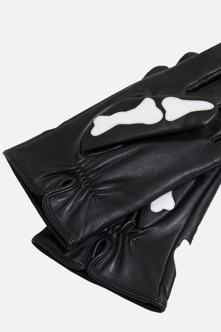 the Skeleton Gloves are constructed from vegan pu leather and have an elasticized closing at the wrist and are finished with white vegan pu leather skeleton applique.