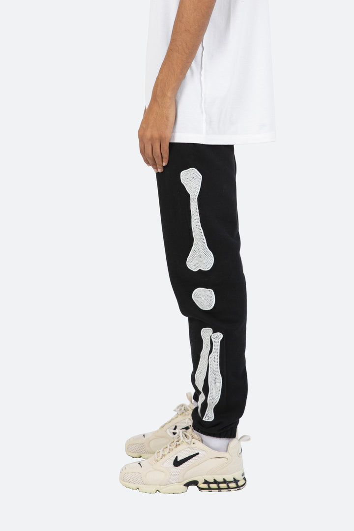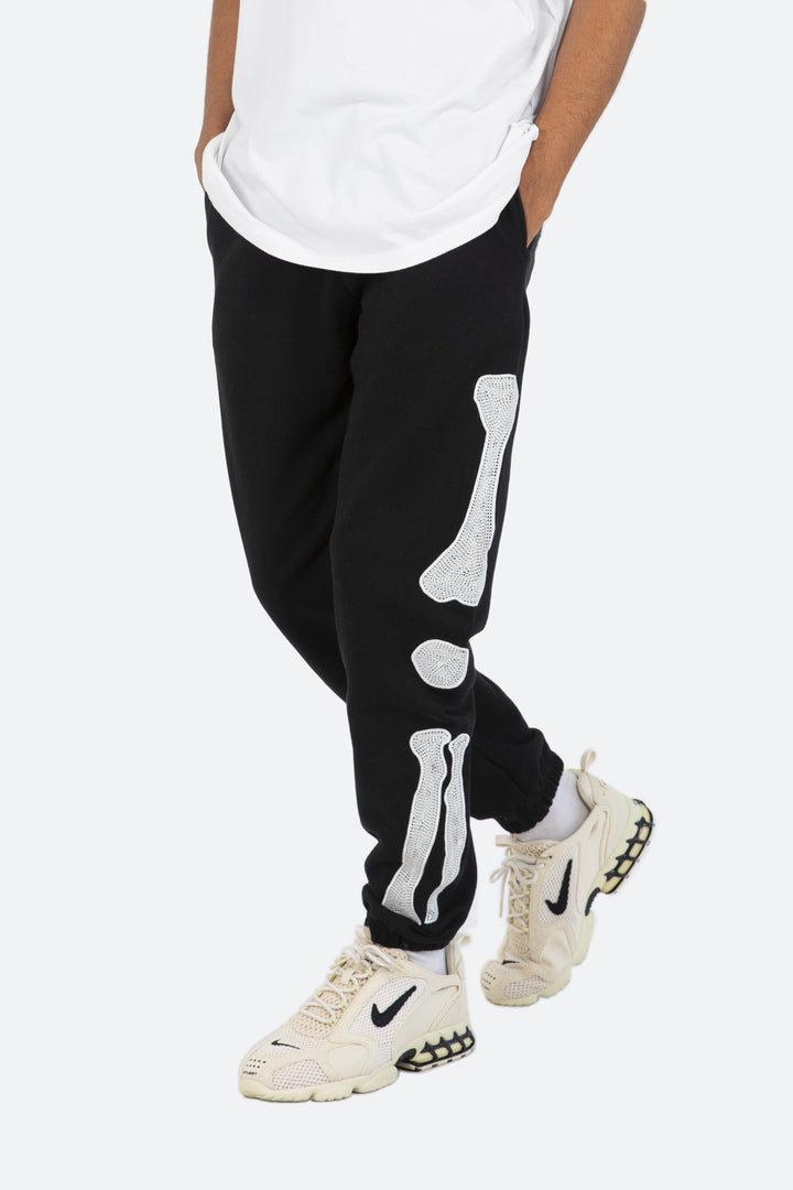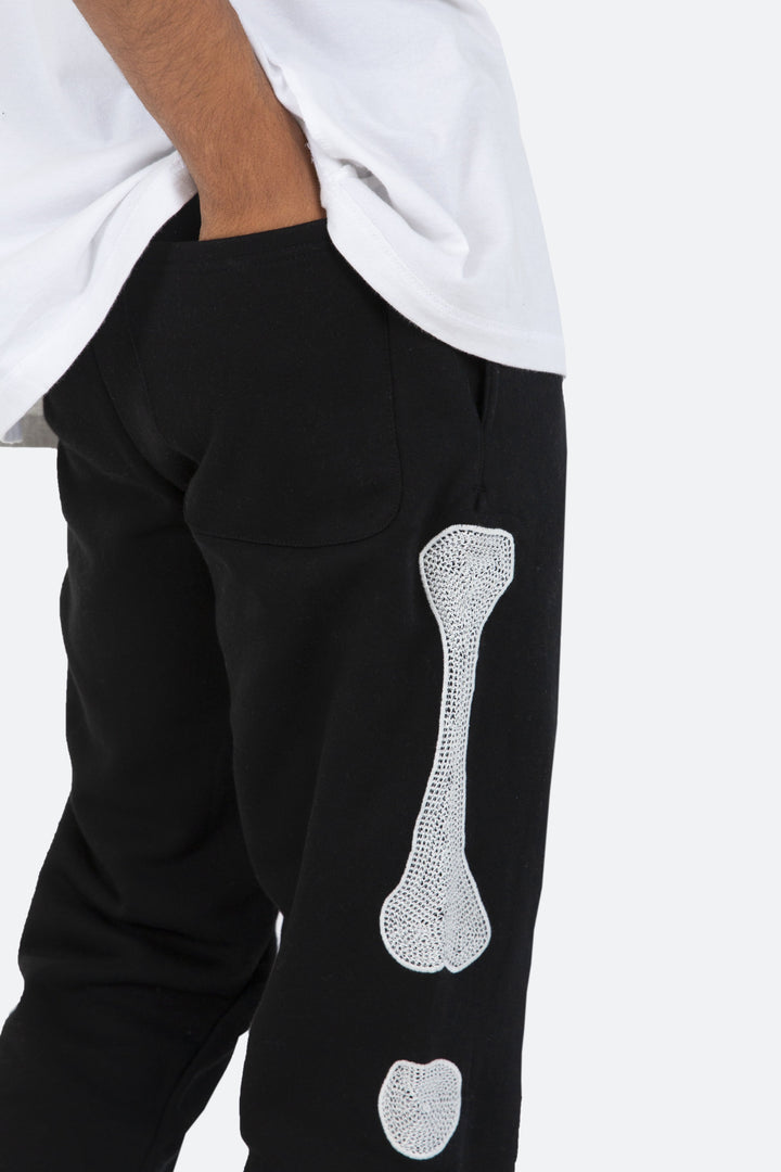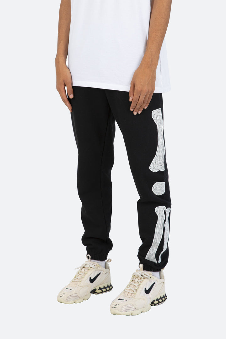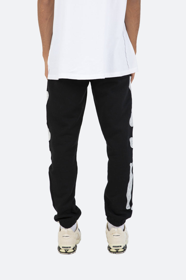 the Skeleton Sweatpants are designed with a relaxed fit throughout, featuring an elasticized self waist and leg opening, tonal cotton drawstrings, and finished with chain stitch embroidery at the outseam.