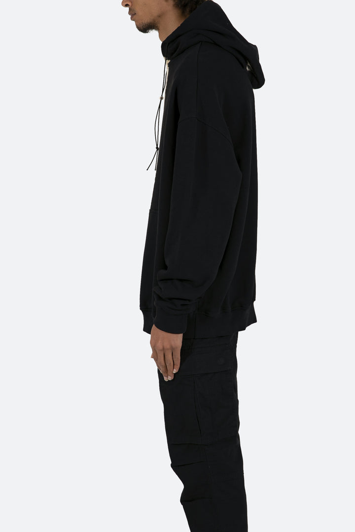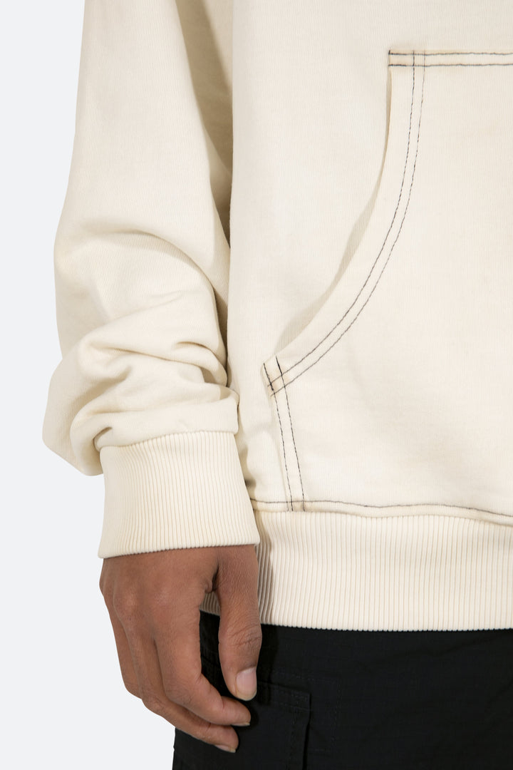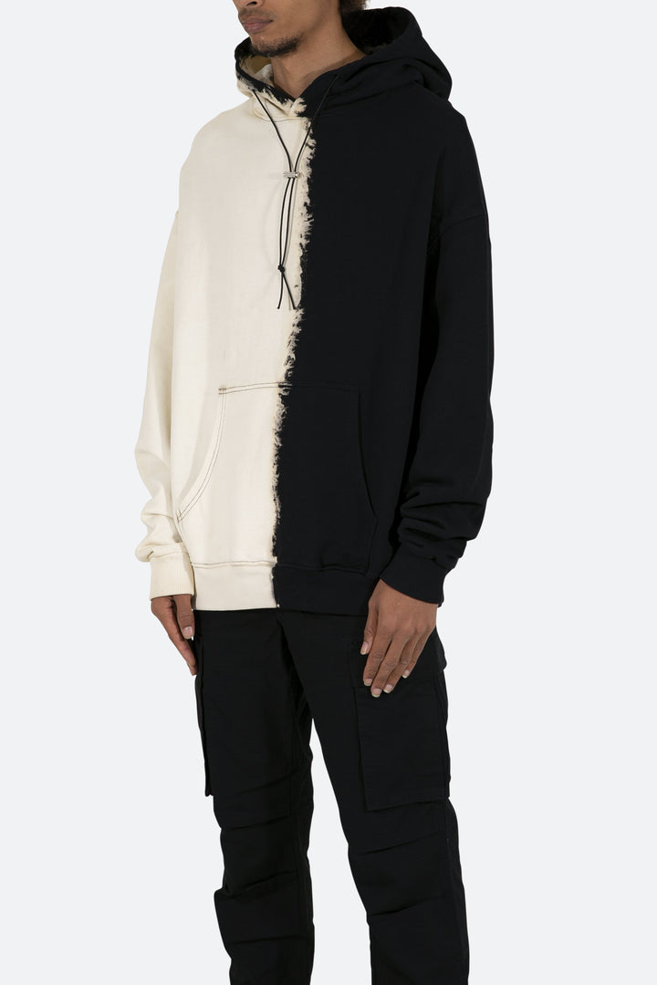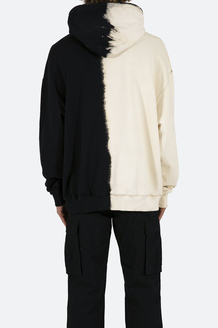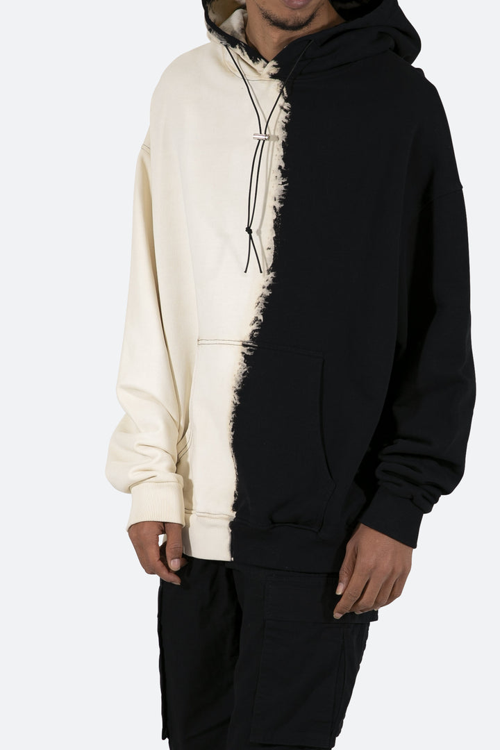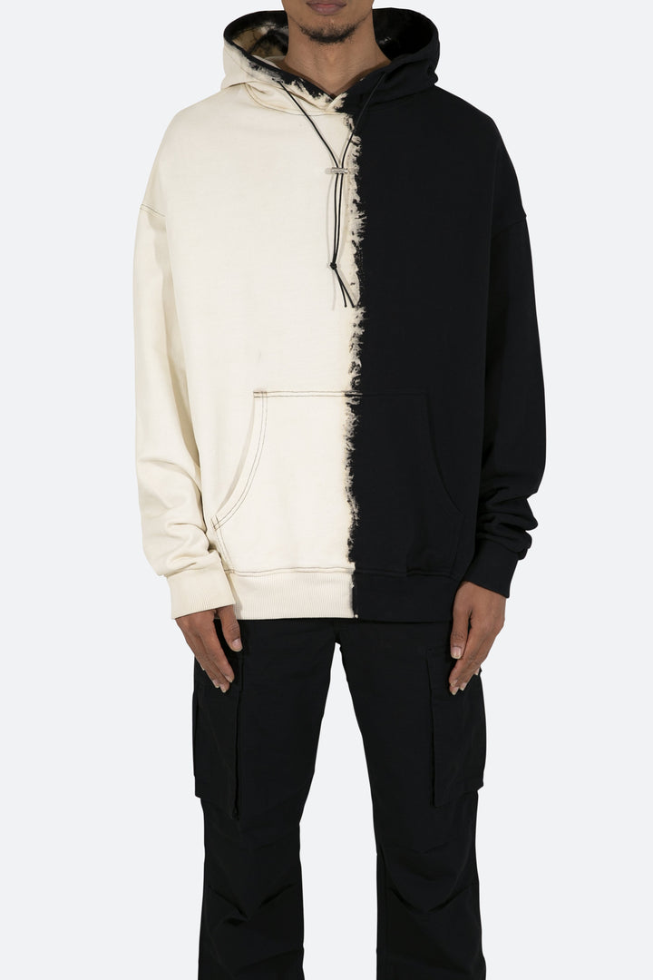 The Split Wash Hoodie features a relaxed fit with a dropped shoulder design, front pouch pocket, ribbing at the wrists and waist, constructed from a washed and brushed fleece fabric, and finished with half of the garment bleached.