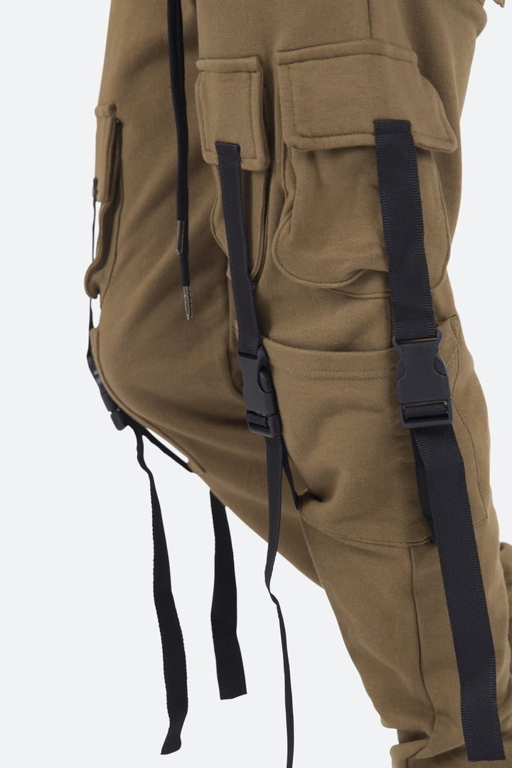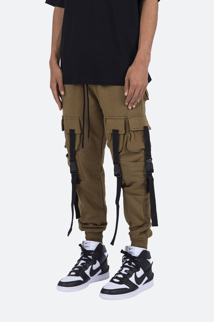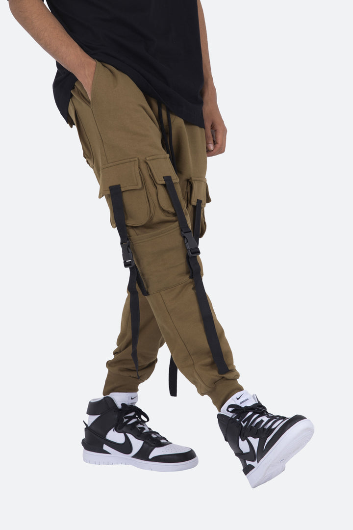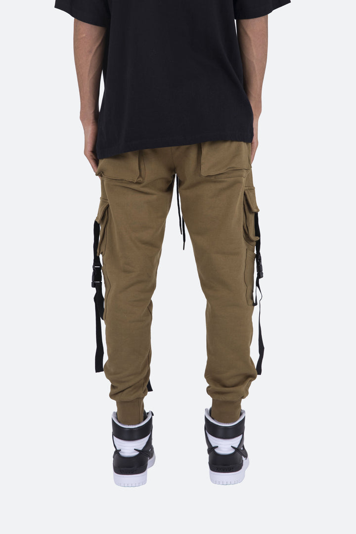the Tactical Cargo Sweatpants are designed with a cotton terry fabric and relaxed fit, featuring multiple cargo pockets, black webbing straps with black plastic closures, and finished off with ribbing at the leg opening.