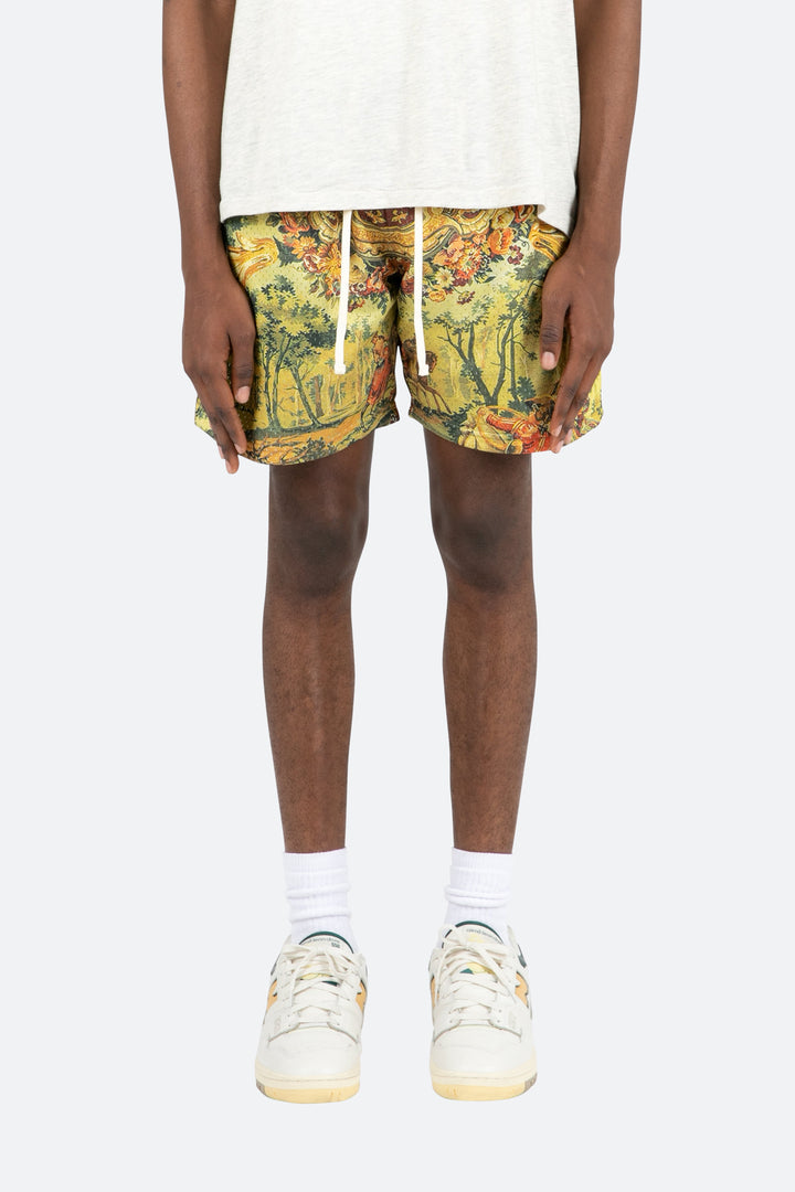 the Tapestry Mesh Shorts are constructed with a custom-knit mesh fabric in a relaxed fit. The short feature an elasticized waist in self fabric, welt pockets at the outseam, all over printed pattern, and a natural cotton drawstring.