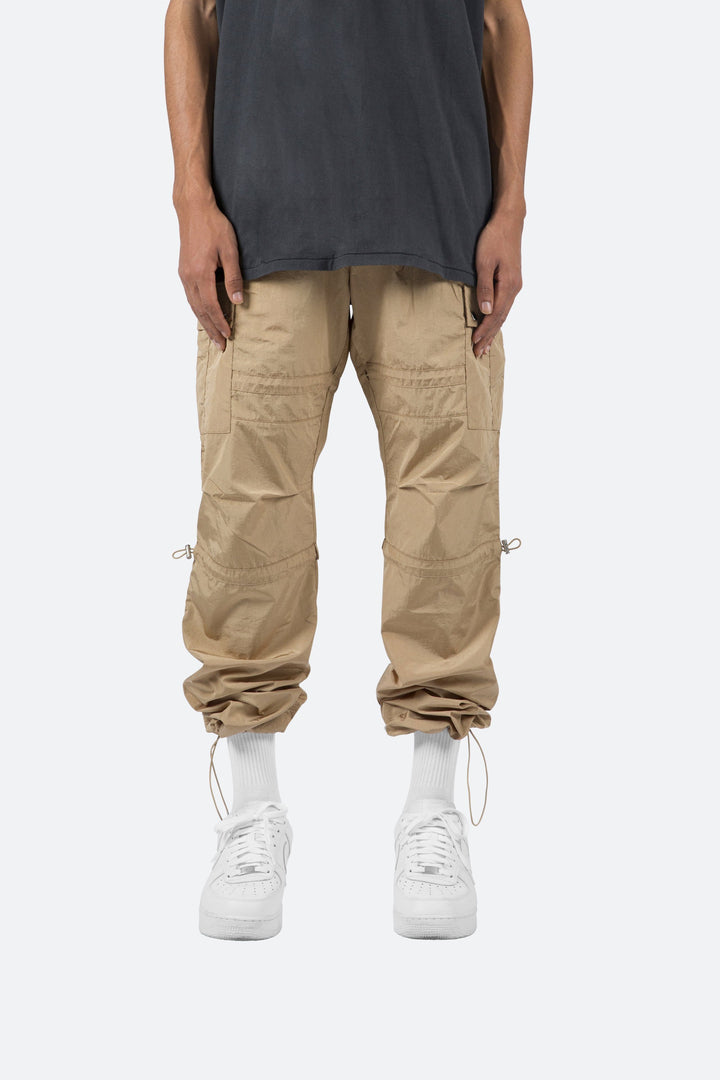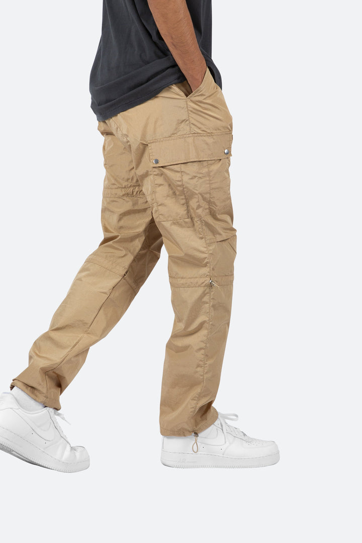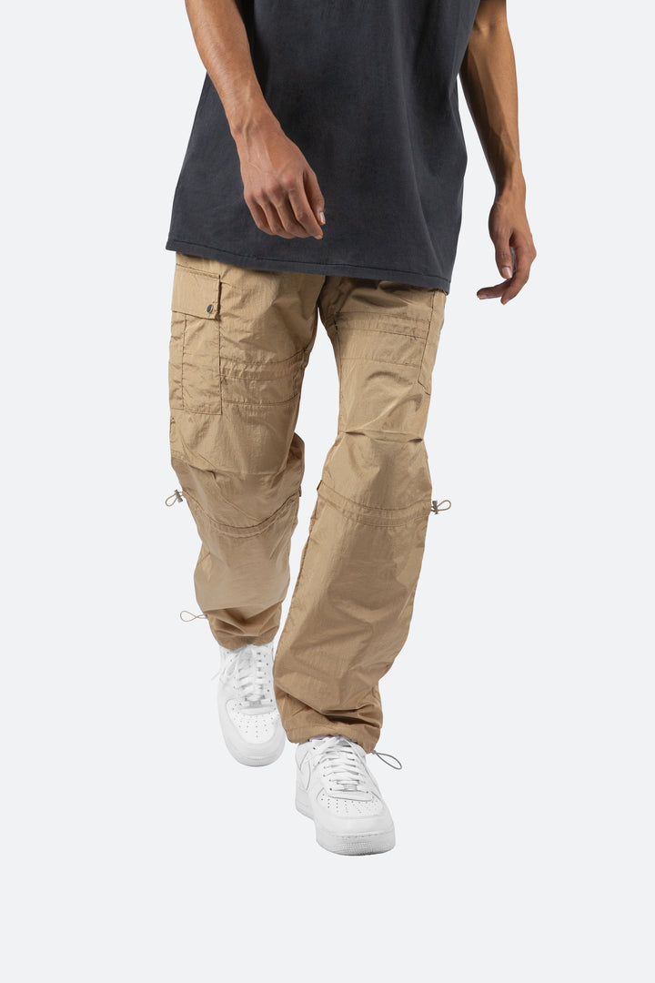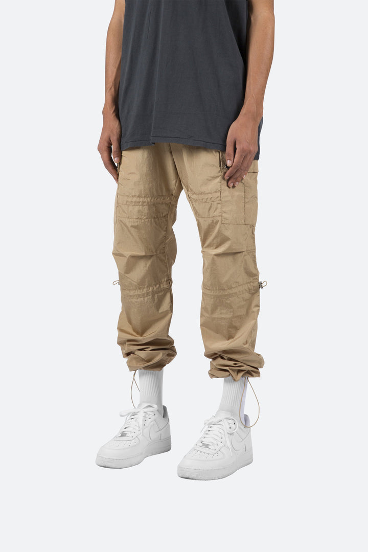 the Tech Cargo Pants are designed with a relaxed fit throughout with cargo pockets at the side seam, zipper fly, and finishing off with elastic drawcords at the knee and leg openings.