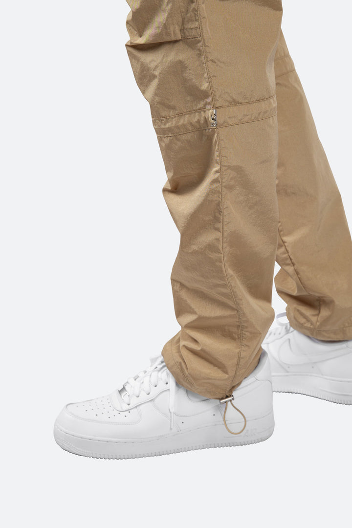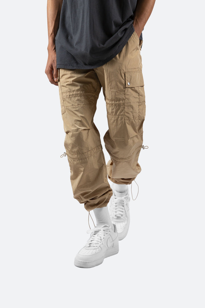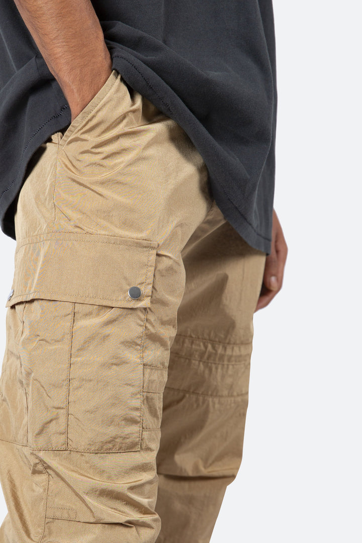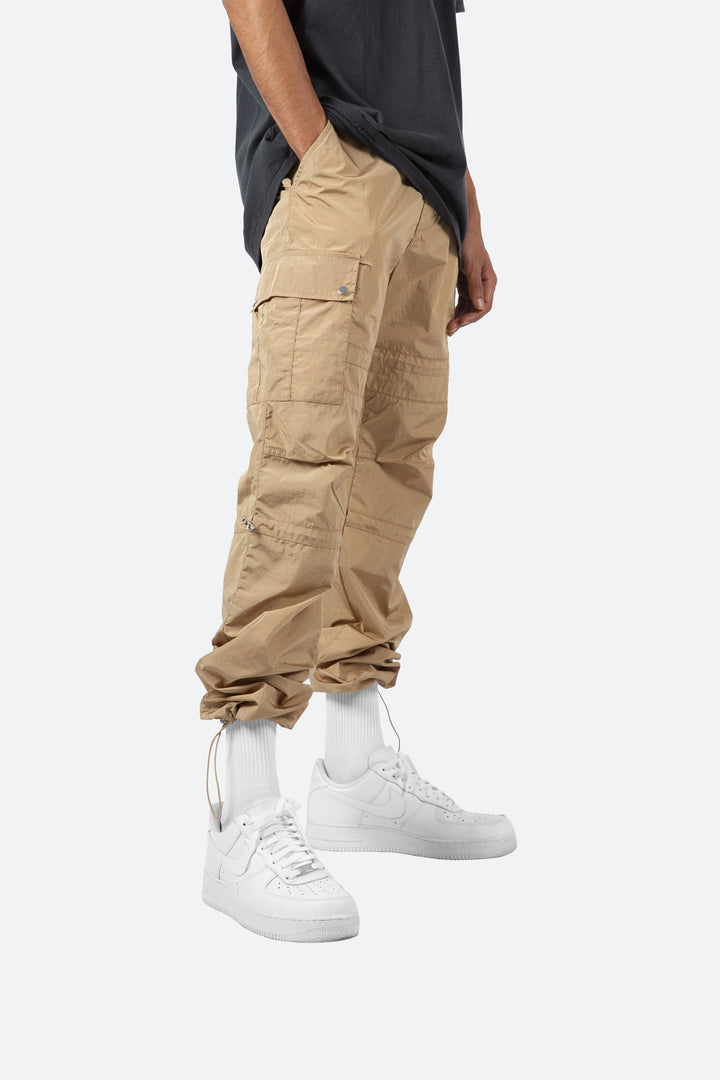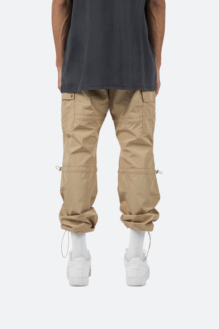 the Tech Cargo Pants are designed with a relaxed fit throughout with cargo pockets at the side seam, zipper fly, and finishing off with elastic drawcords at the knee and leg openings.