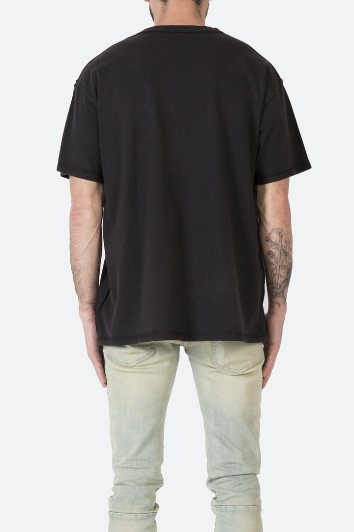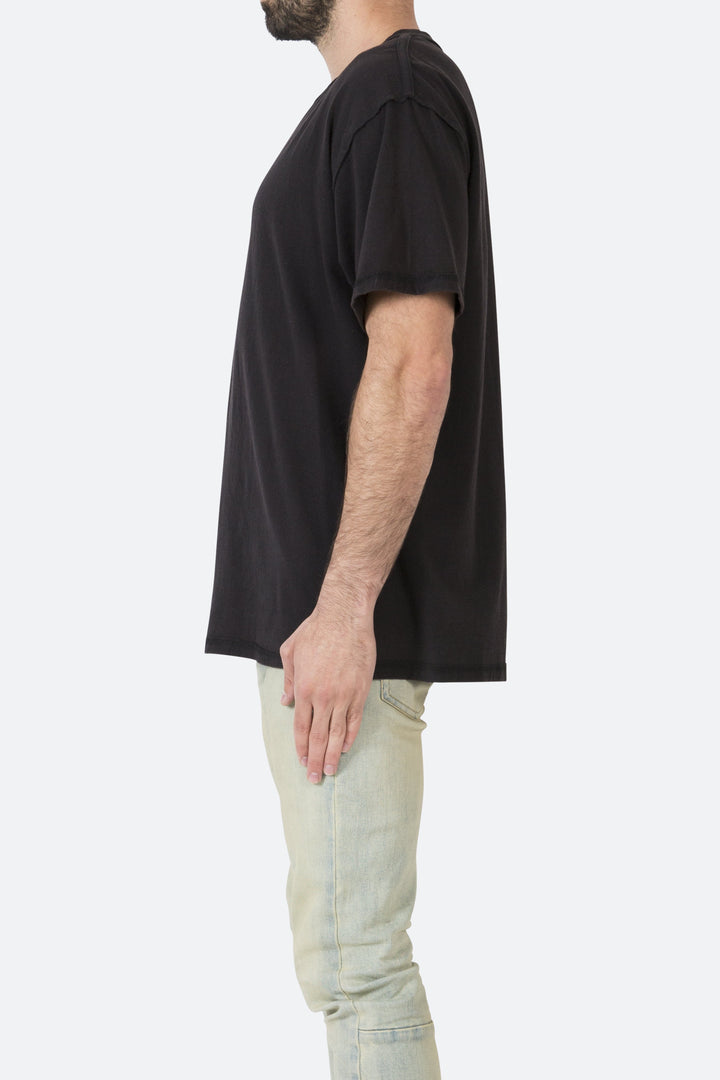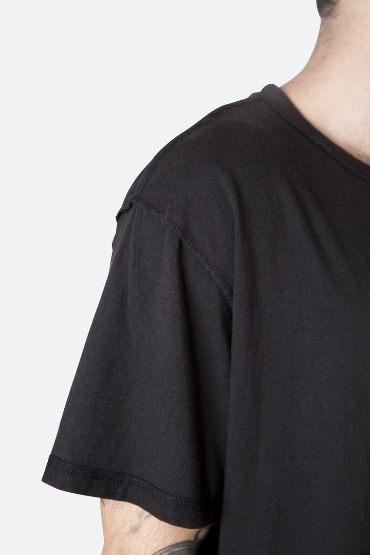 the inside out tee features a flat hem line and an extended shoulder seam for an oversized, dropped shoulder fit, and constructed inside out to expose seams and the hem.