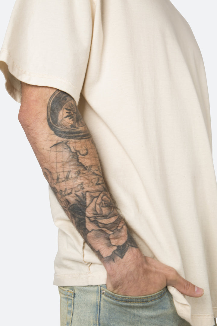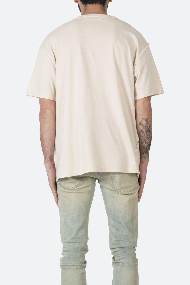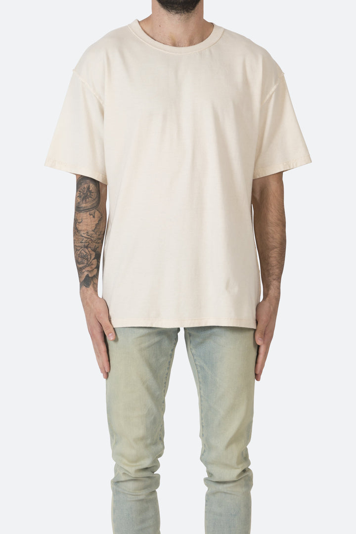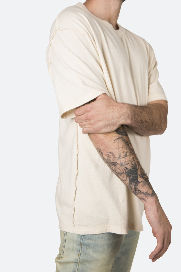 the inside out tee features a flat hem line and an extended shoulder seam for an oversized, dropped shoulder fit, and constructed inside out to expose seams and the hem.