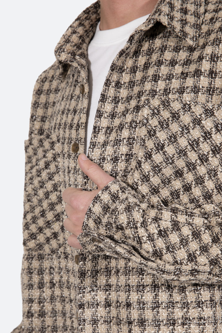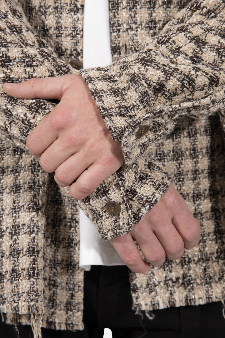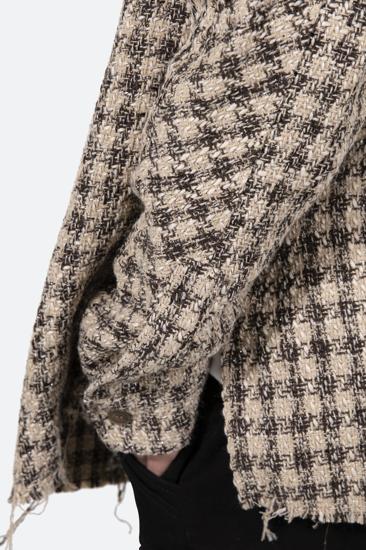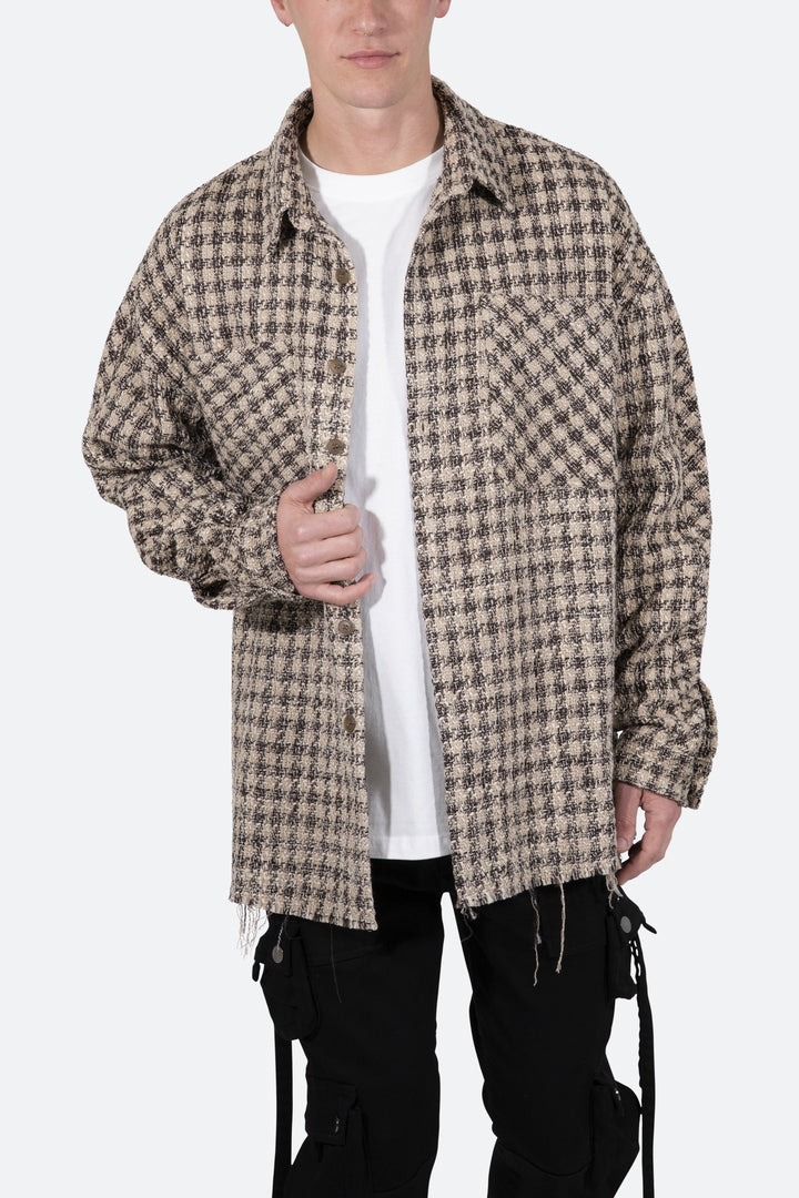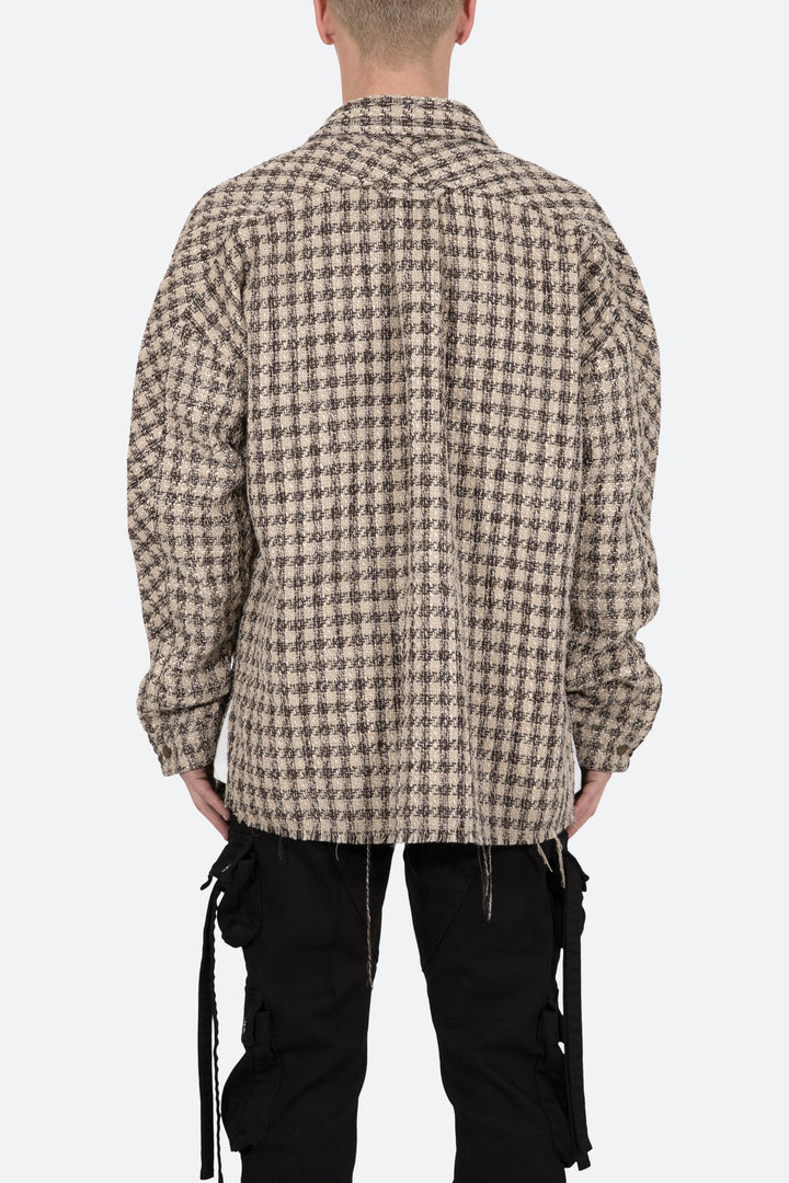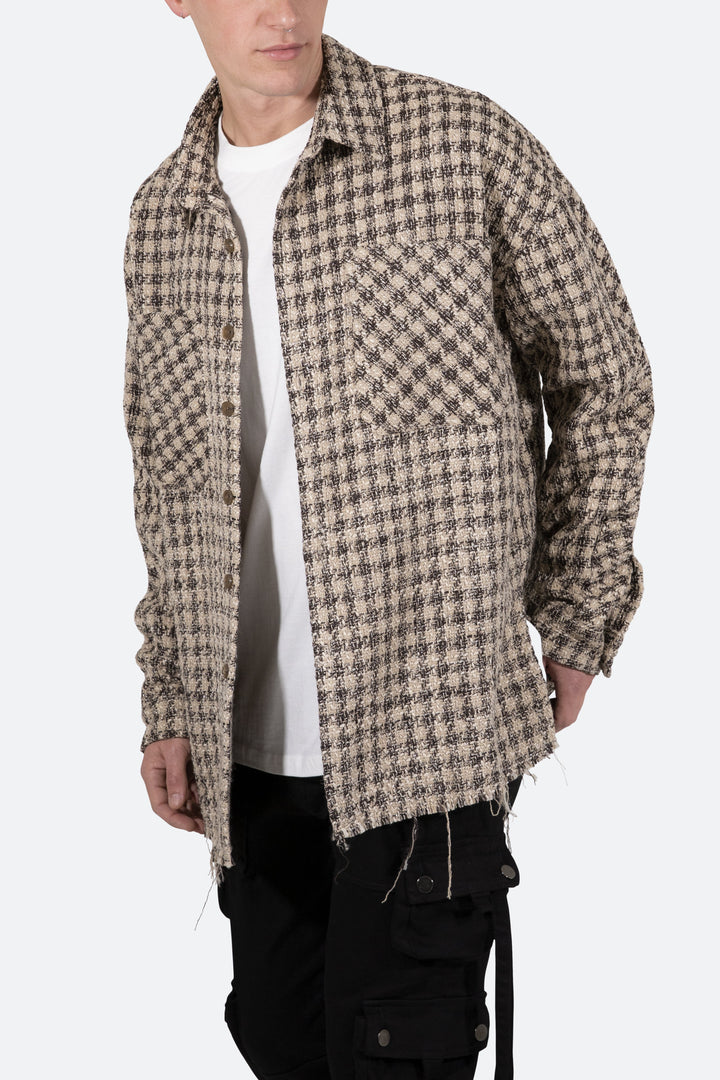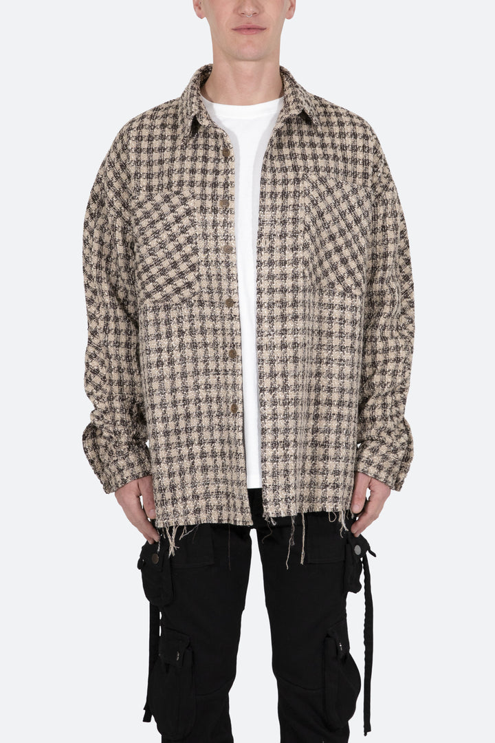 the Loose Woven Flannel Shirt is designed with an oversized fit, a raw hemline, pleats at the wrist with an adjustable button closure, and finished in a loose weave custom polyester plaid fabric that contains small shining threads in the pattern.