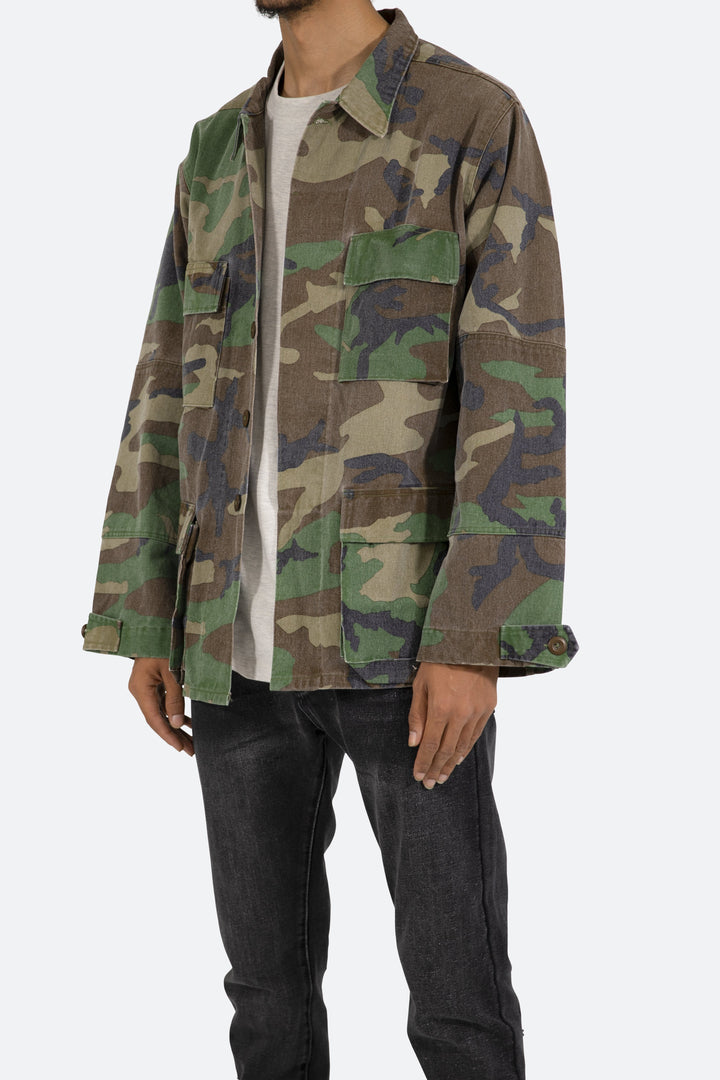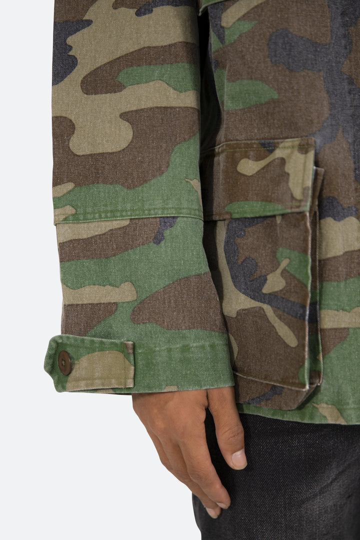 the M65 Shirt is designed with a relaxed fit and features a flat hemline, an adjustable button closure at the wrist, cargo pockets on the chest and waist, and finished in a custom developed camo printed twill fabric with a vintage wash.