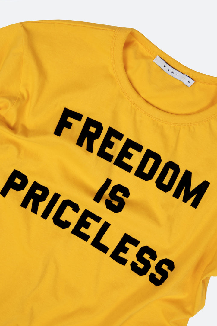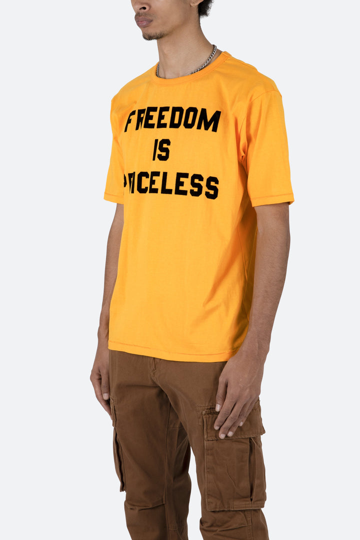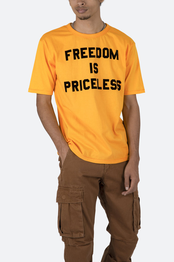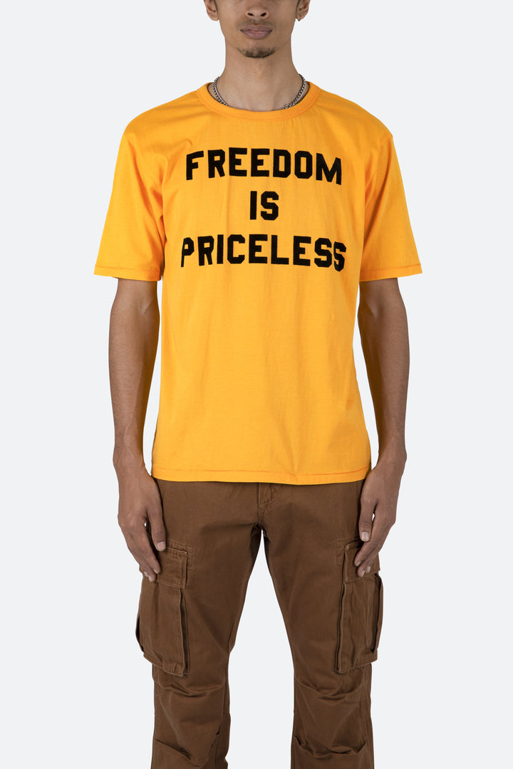 the Priceless Tee features a classic fit, ribbing at the neck, a standard hem, washed for improved hand-feel, and finished with a “FREEDOM IS PRICELESS” screen print on the chest.