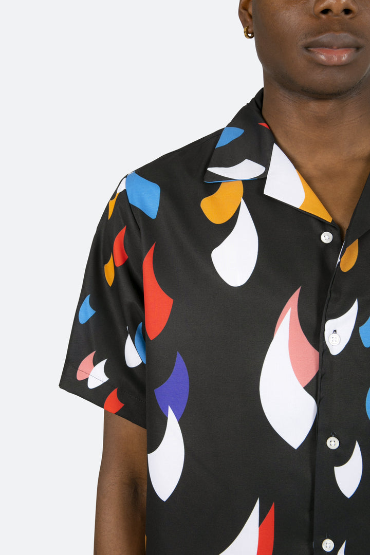 the Teardrop Shirt is made from a lightweight viscose fabric with a sublimated teardrop pattern throughout. The relaxed-fit shirt features a camp collar and flat hem.