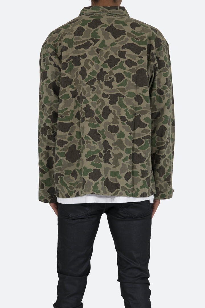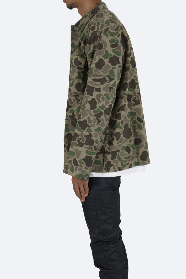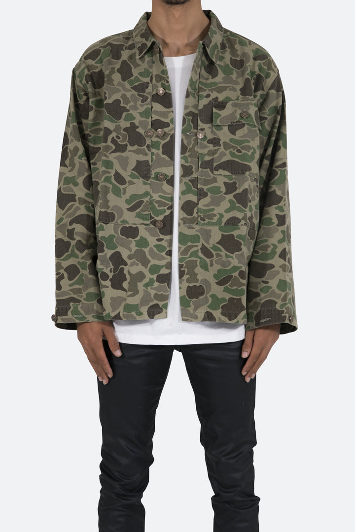the Twill Camo Shirt is designed with a relaxed fit and features a flat hemline, pleats at the wrist, an adjustable button closure, cargo pockets on the chest, and finished in a custom developed camo fabric.
