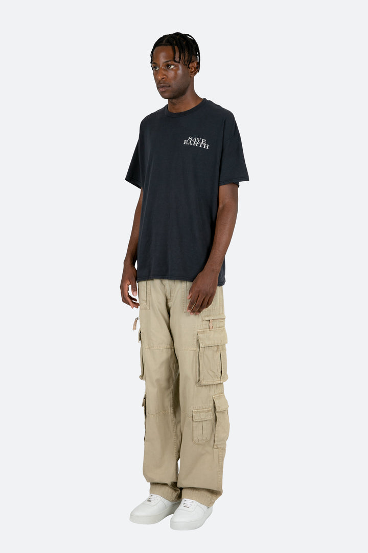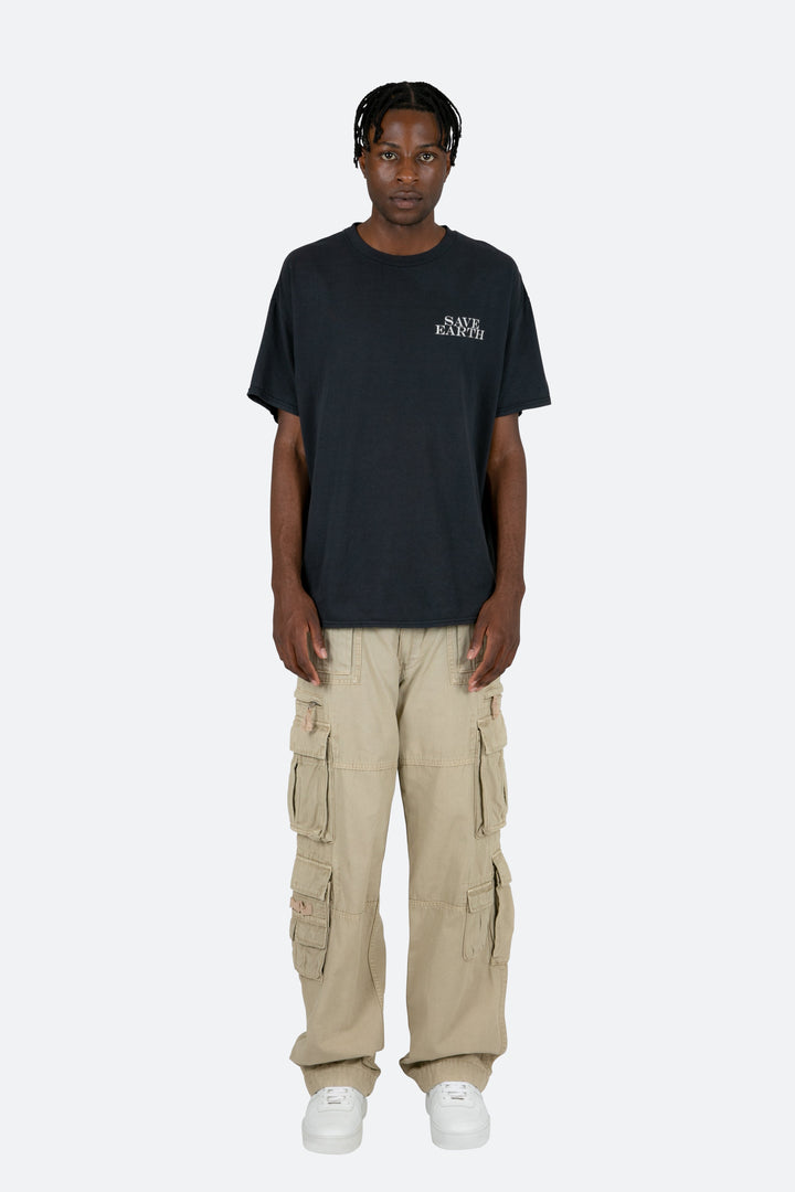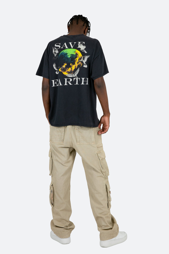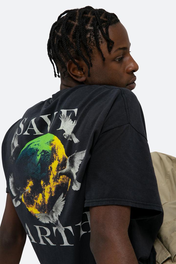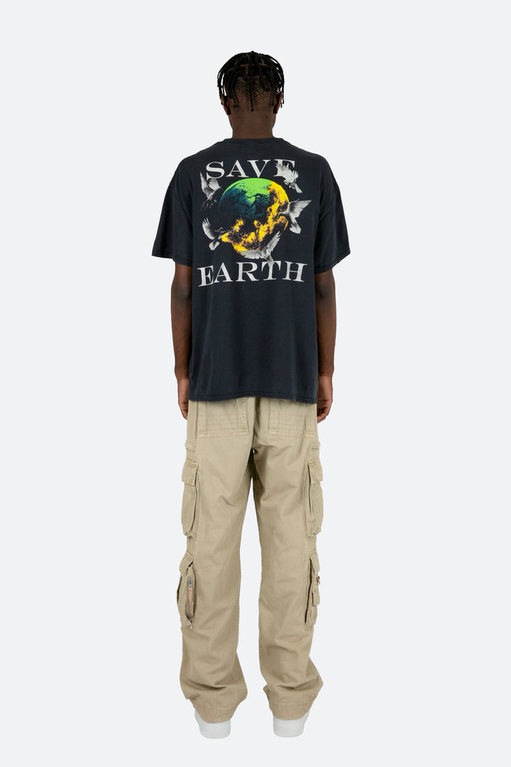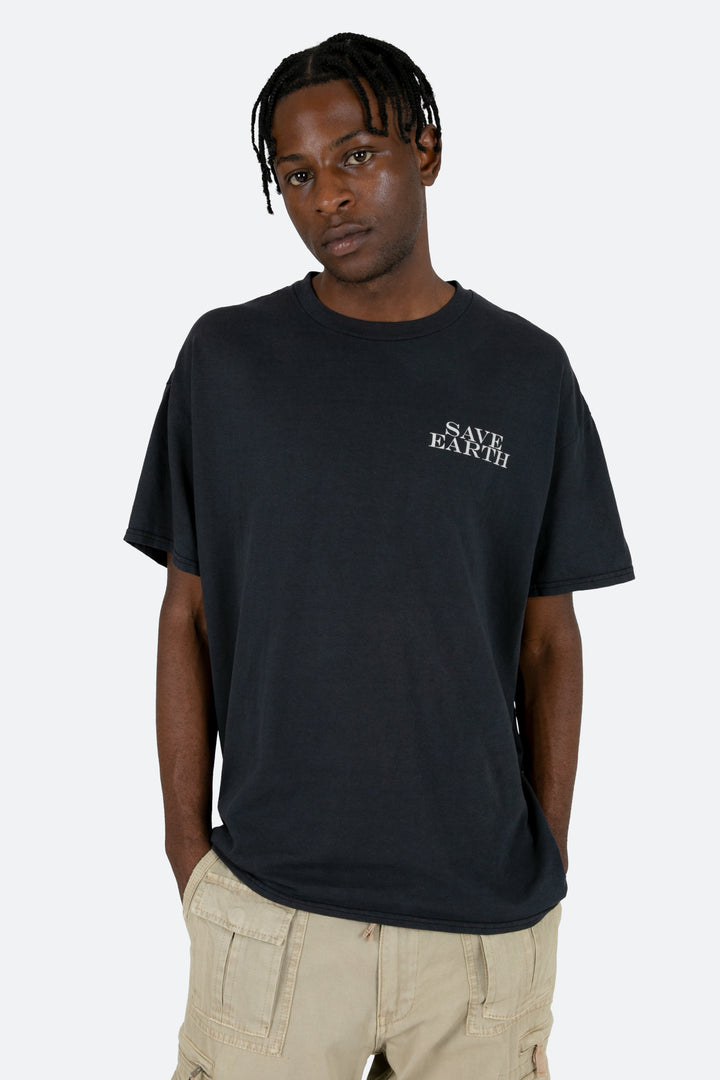 the Vintage Save Earth Tee is printed and washed in the USA. The tee features a relaxed fit, ribbing at the neck, a standard hem, printed graphics and finished with a custom developed vintage wash for vintage like hand-feel and color.