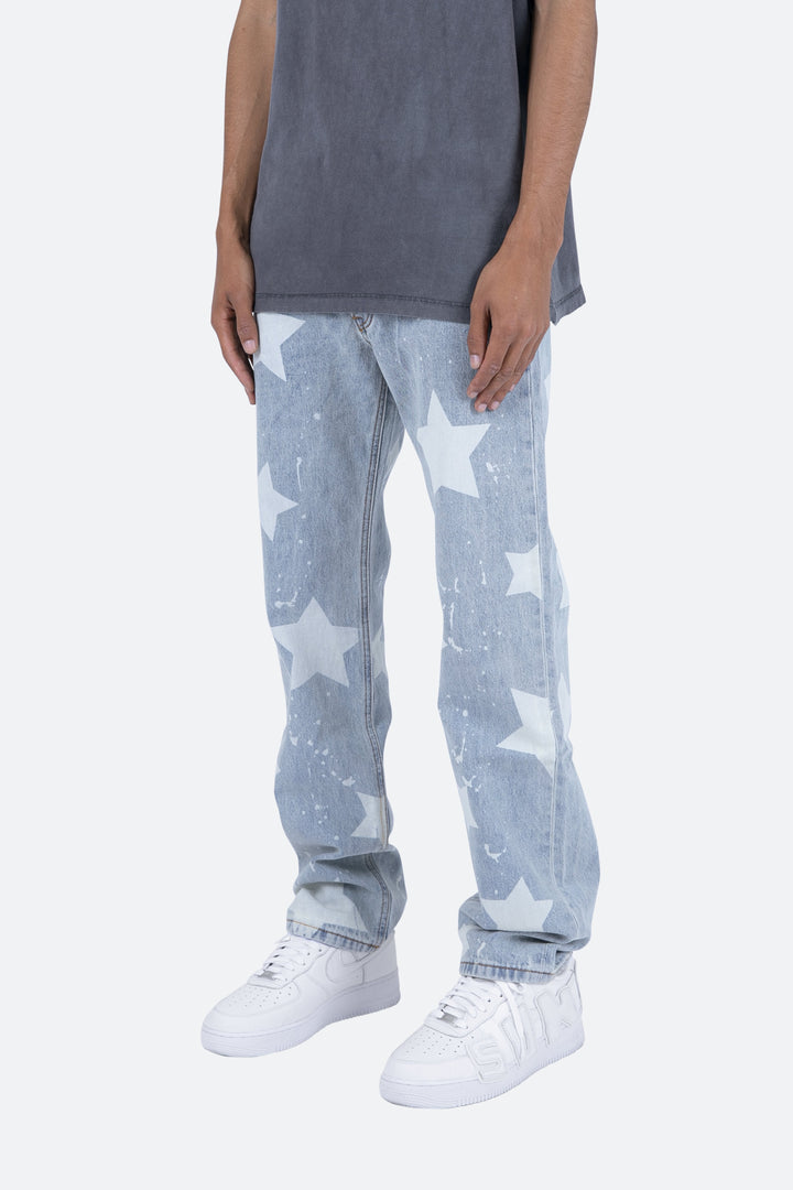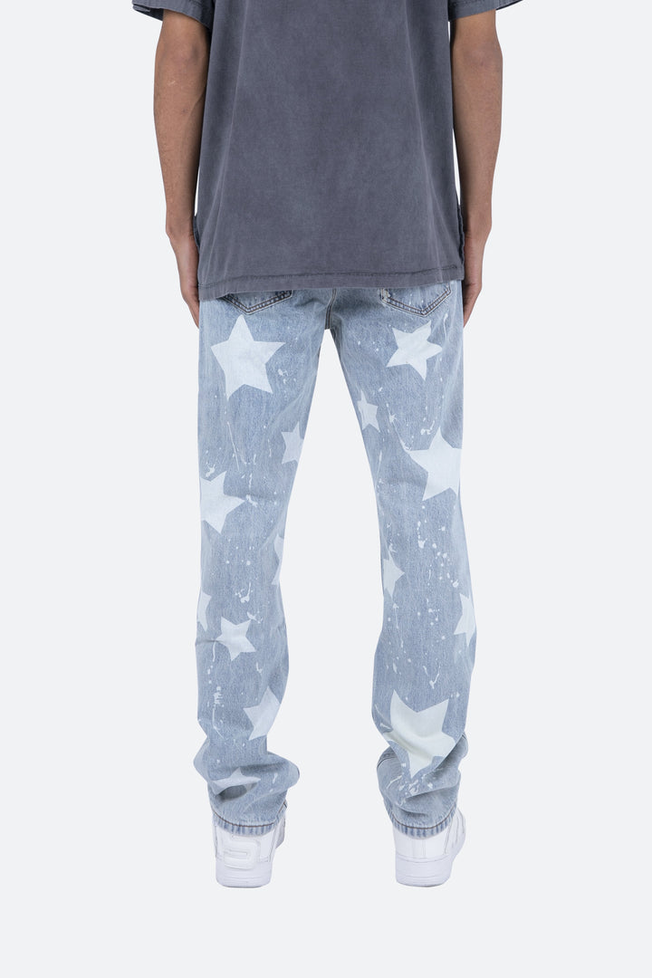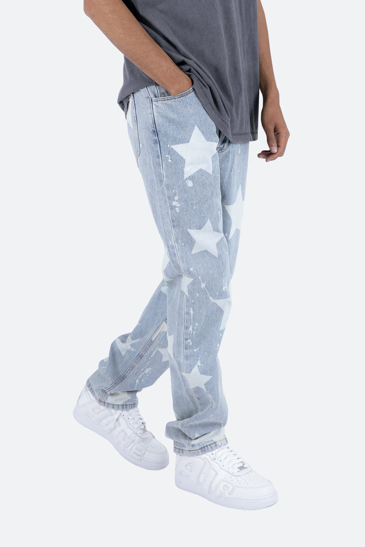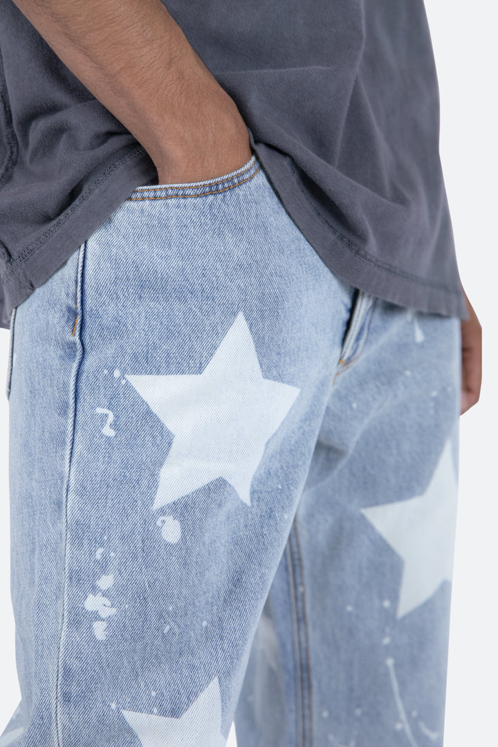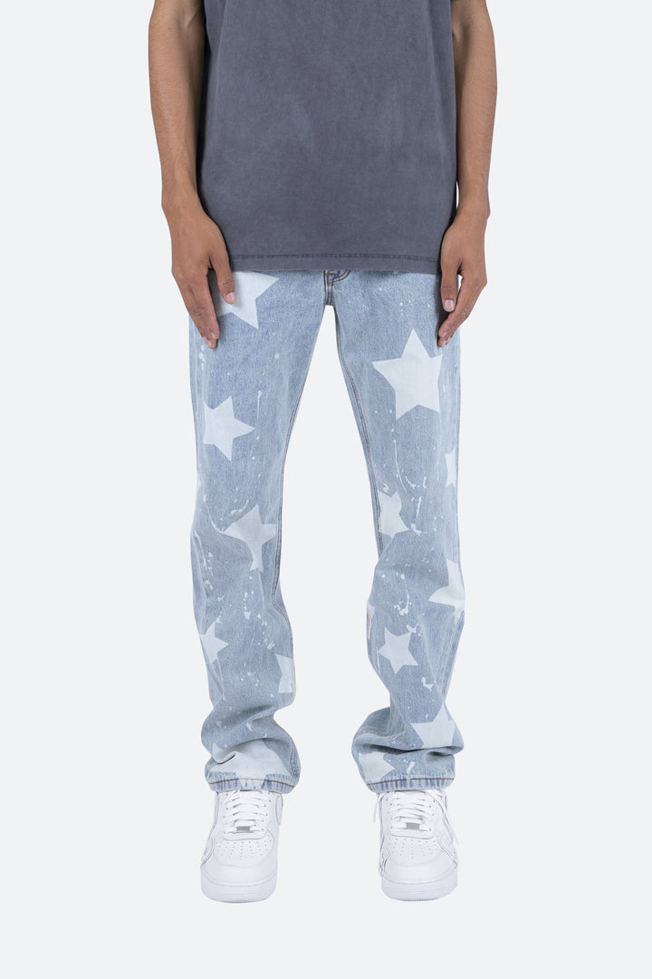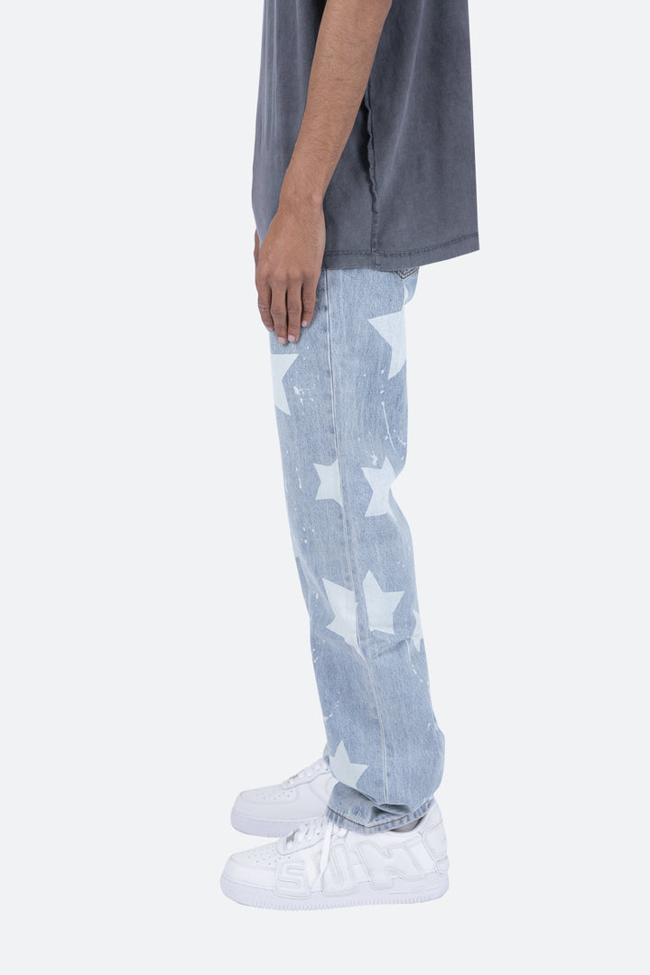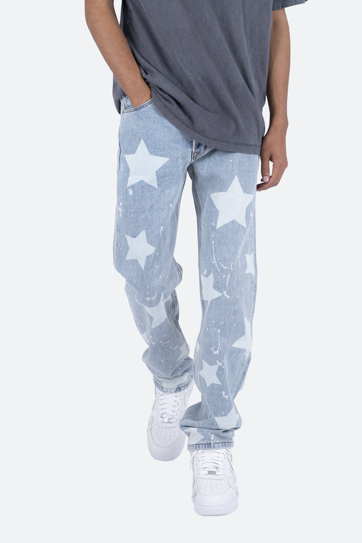 the V120 Baggy Star Denim is designed with our new V fit which is relaxed throughout and features a light wash and finished with bleached stars and drips throughout.