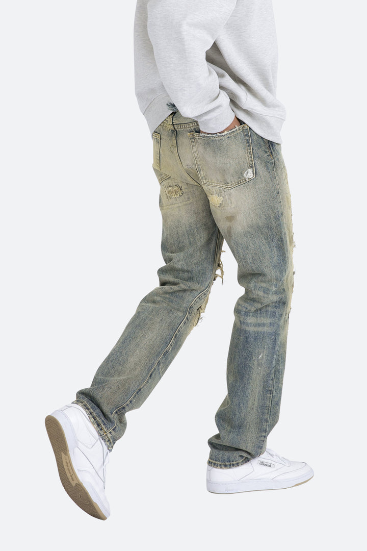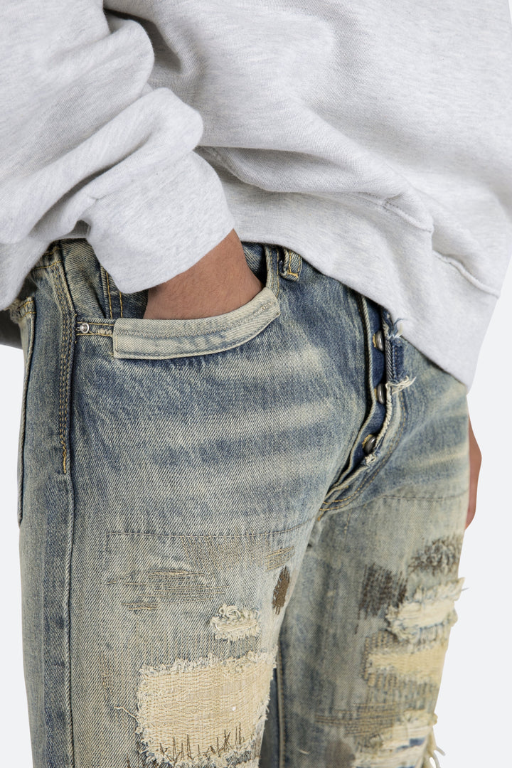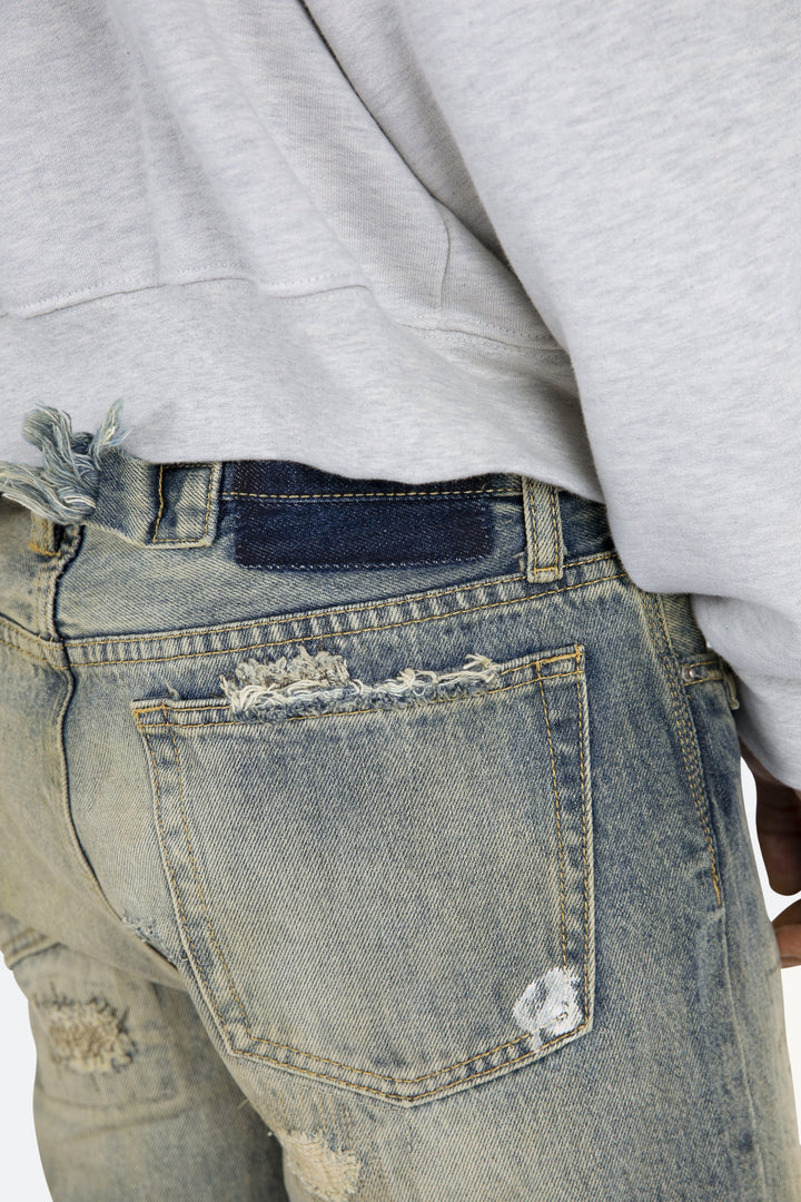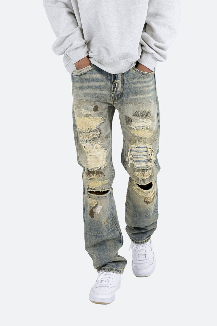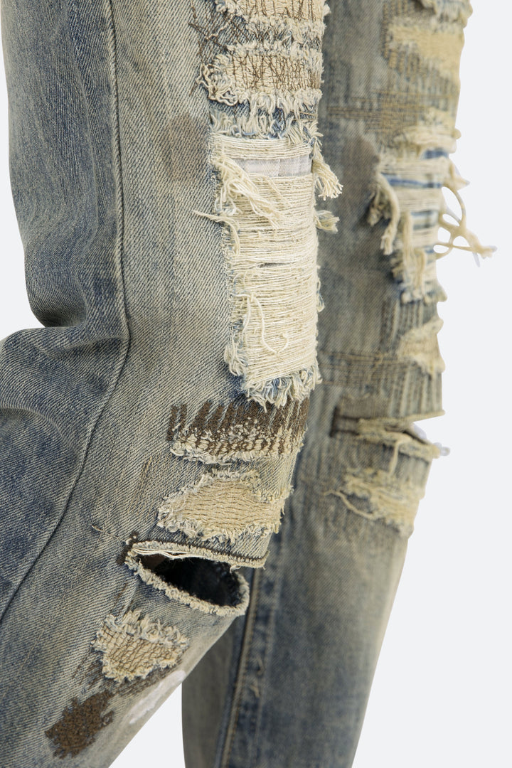 the V154 Baggy Denim is designed with our new V fit which is relaxed throughout and features a light wash, and finished with distressing and contrasting repairs throughout