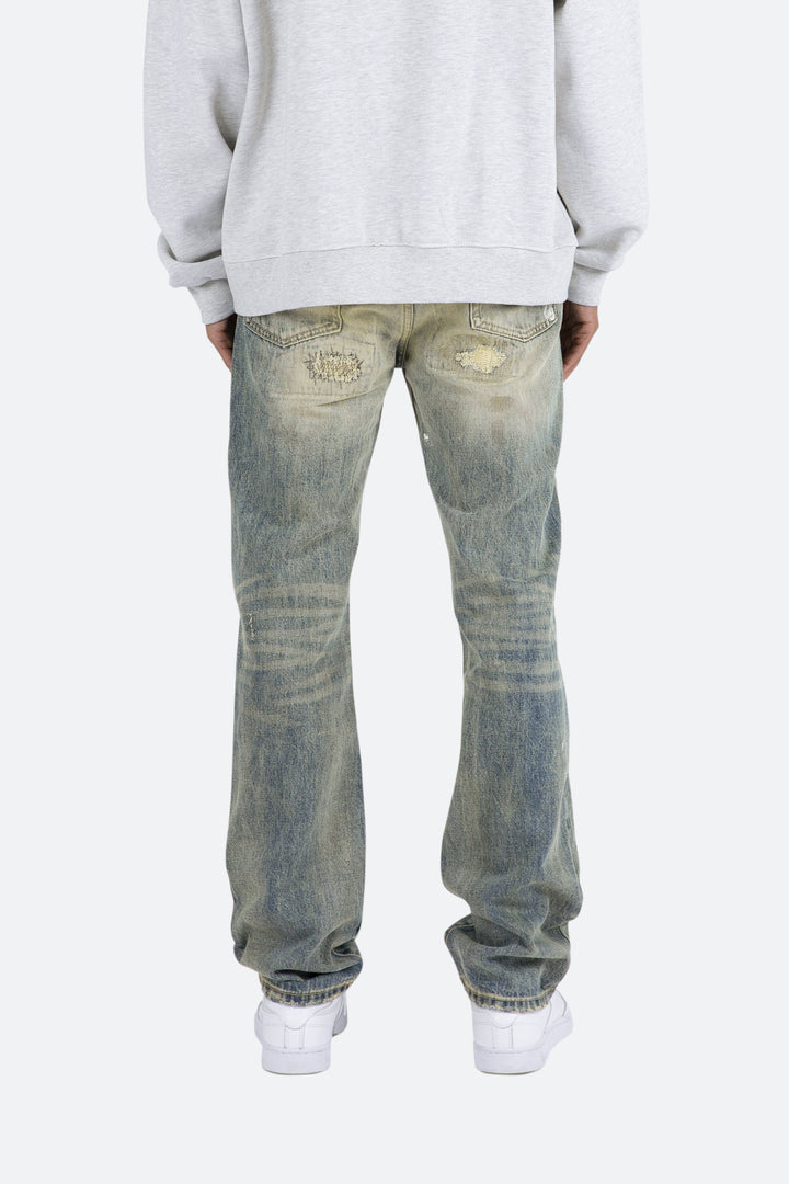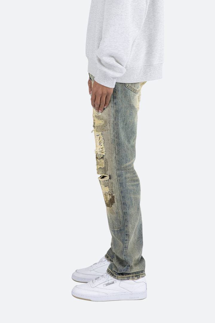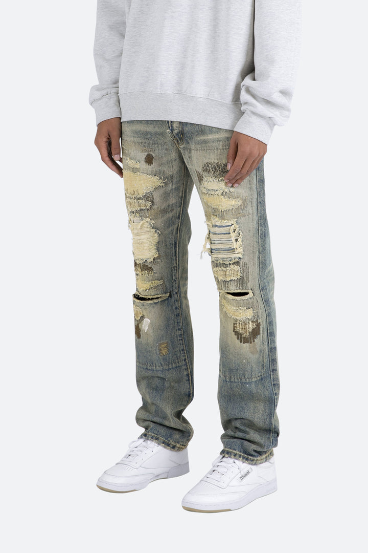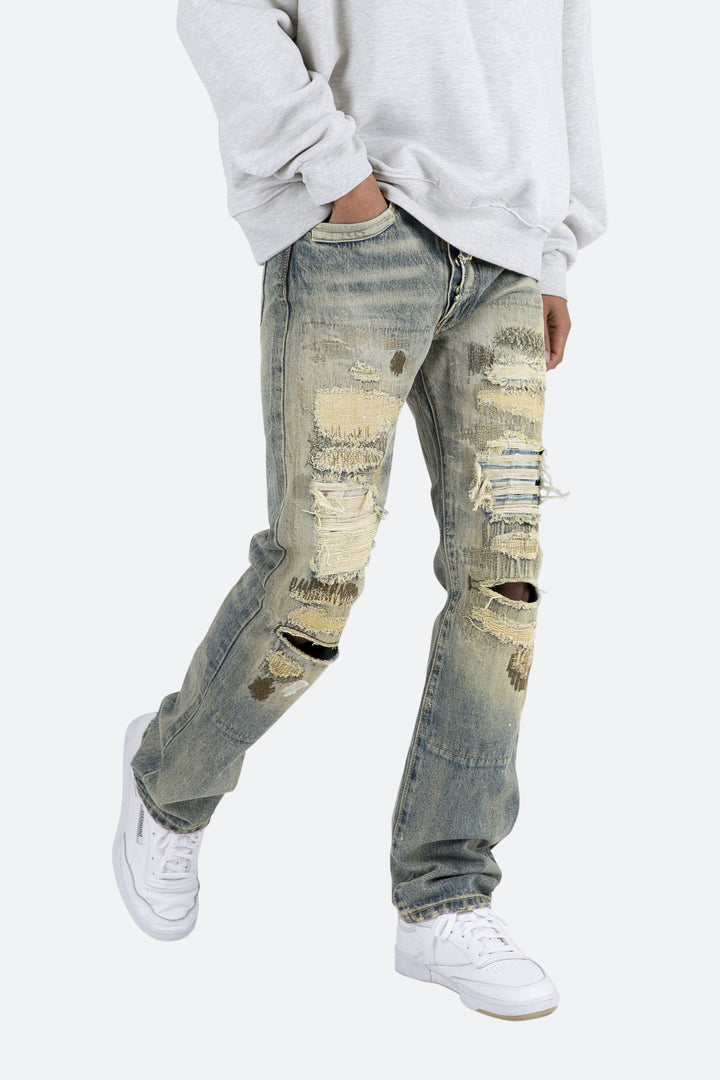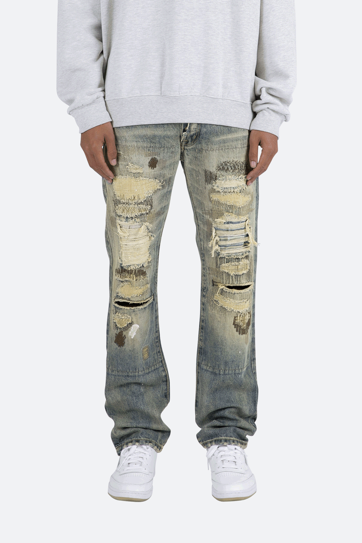 the V154 Baggy Denim is designed with our new V fit which is relaxed throughout and features a light wash, and finished with distressing and contrasting repairs throughout