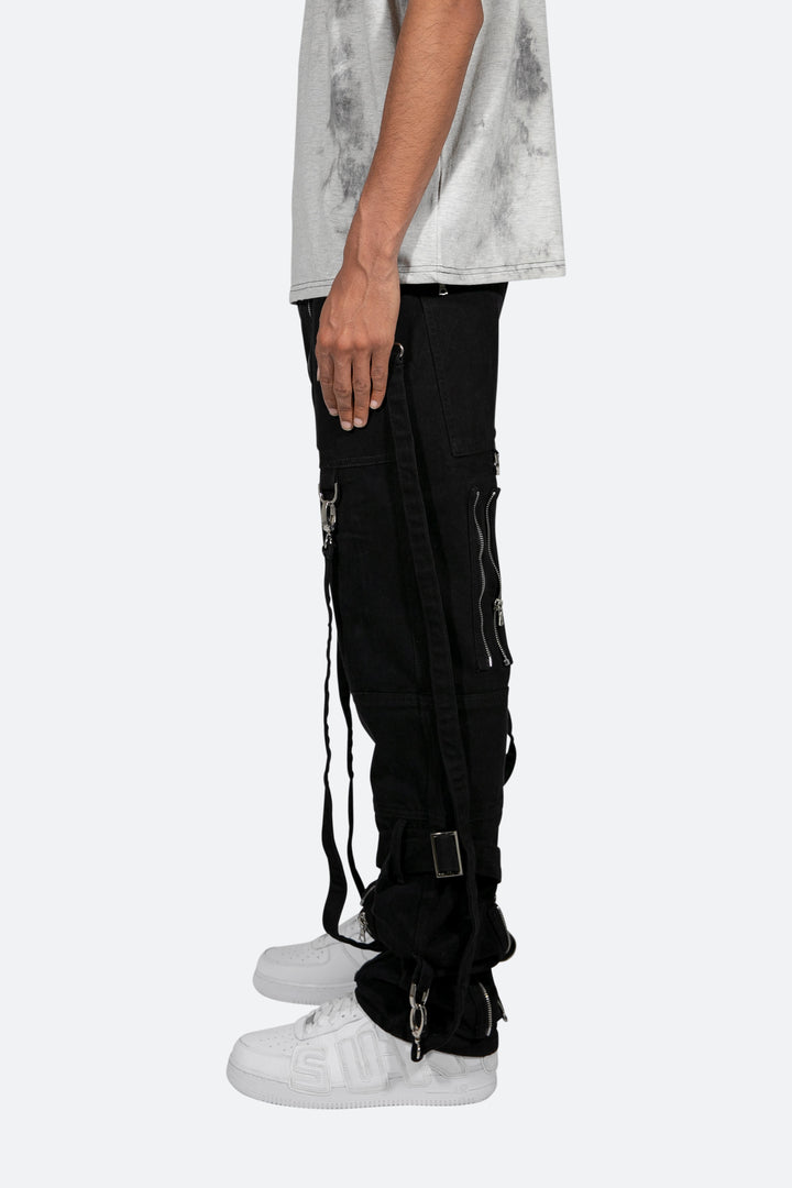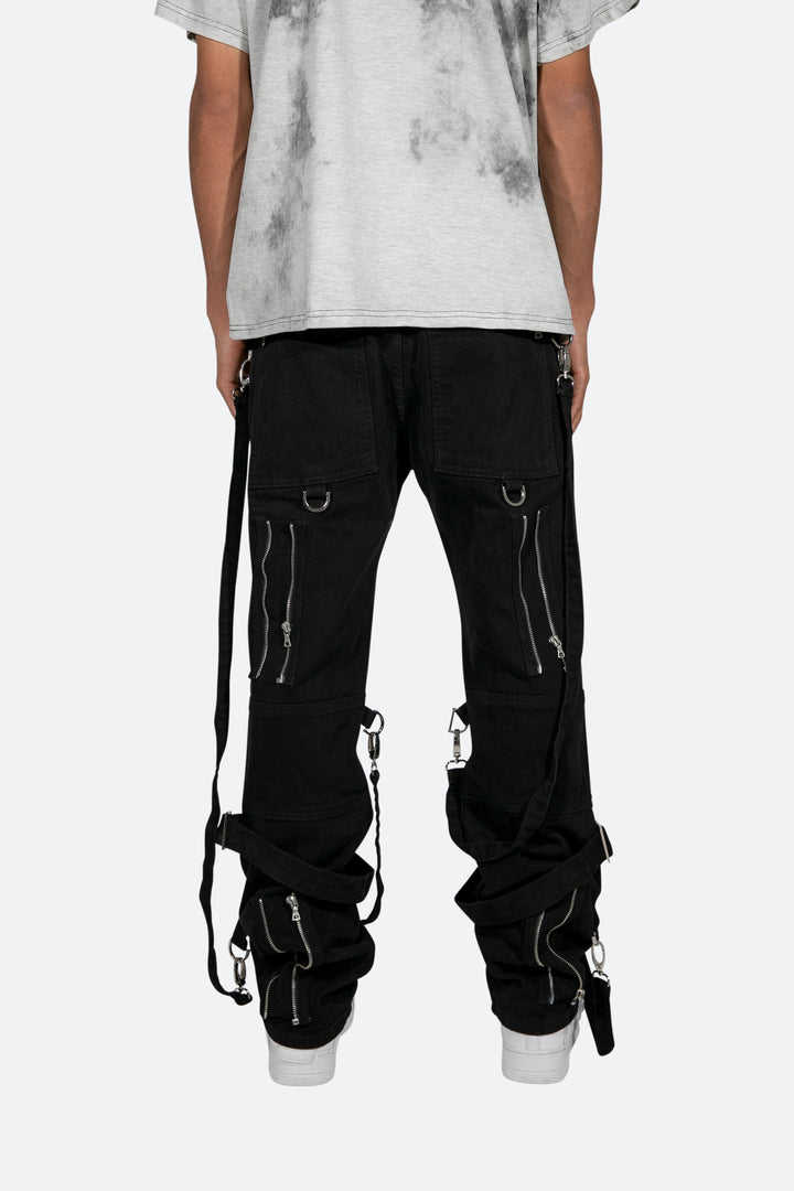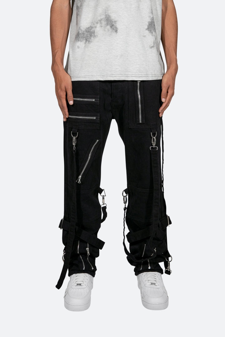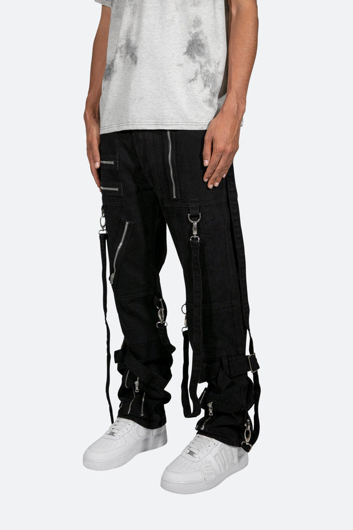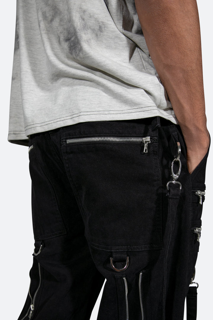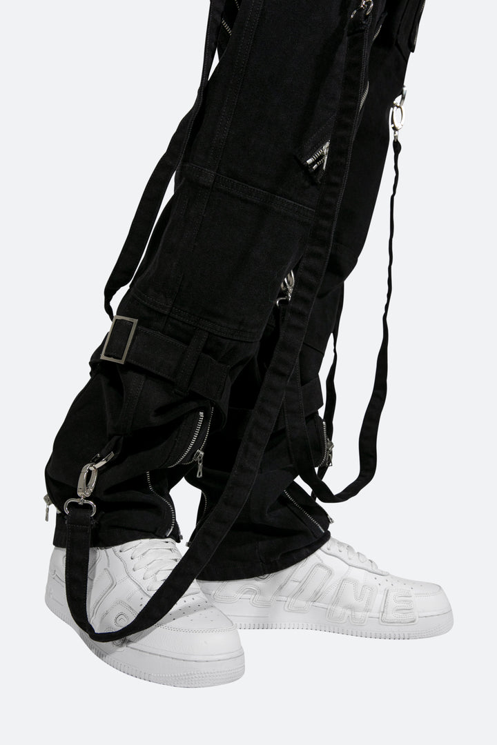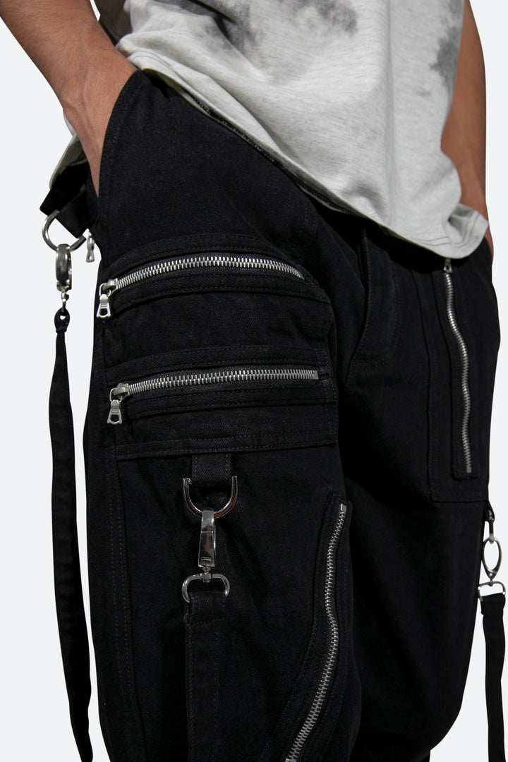 the V458 Strapped Cargo Denim is designed with our new V fit which is relaxed throughout with an extended inseam for stacking, cargo pockets throughout, zipper pockets throughout, zipper details to adjust the fit to a slimmer fit, and finished with straps that hang from metal clips on both legs.