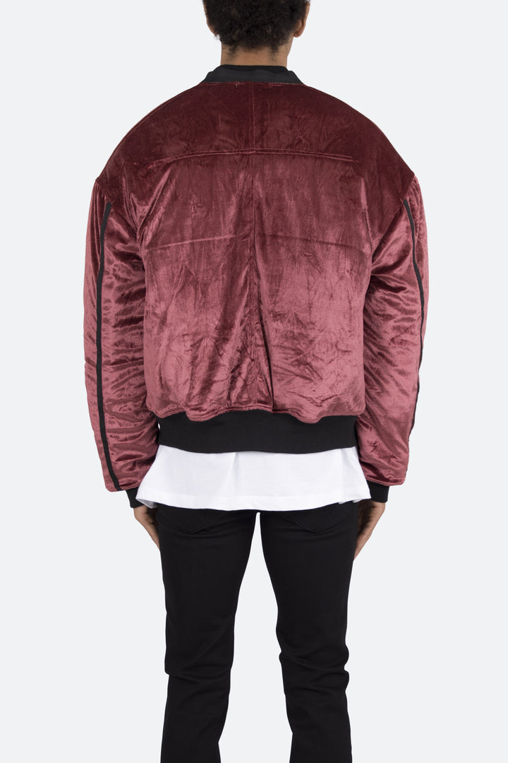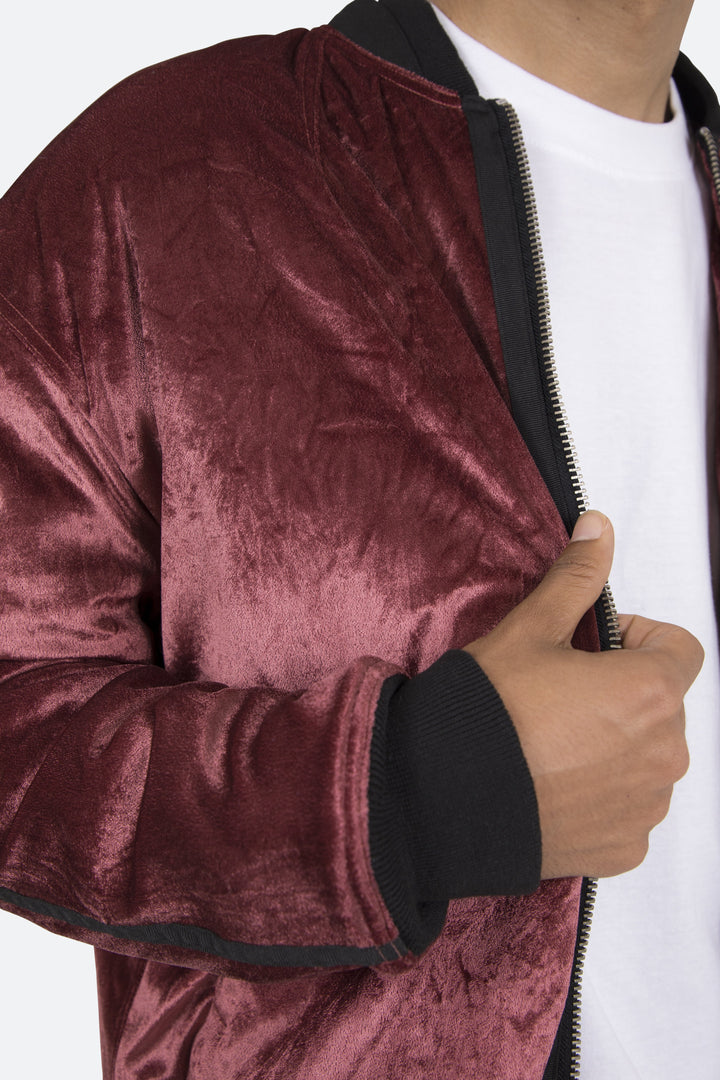 This Velour Bomber Jacket features a polished zipper at the chest with exposed taping, tonal lining, tonal ribbing at the waist, wrists, and collar, and finished with a double layered collar.