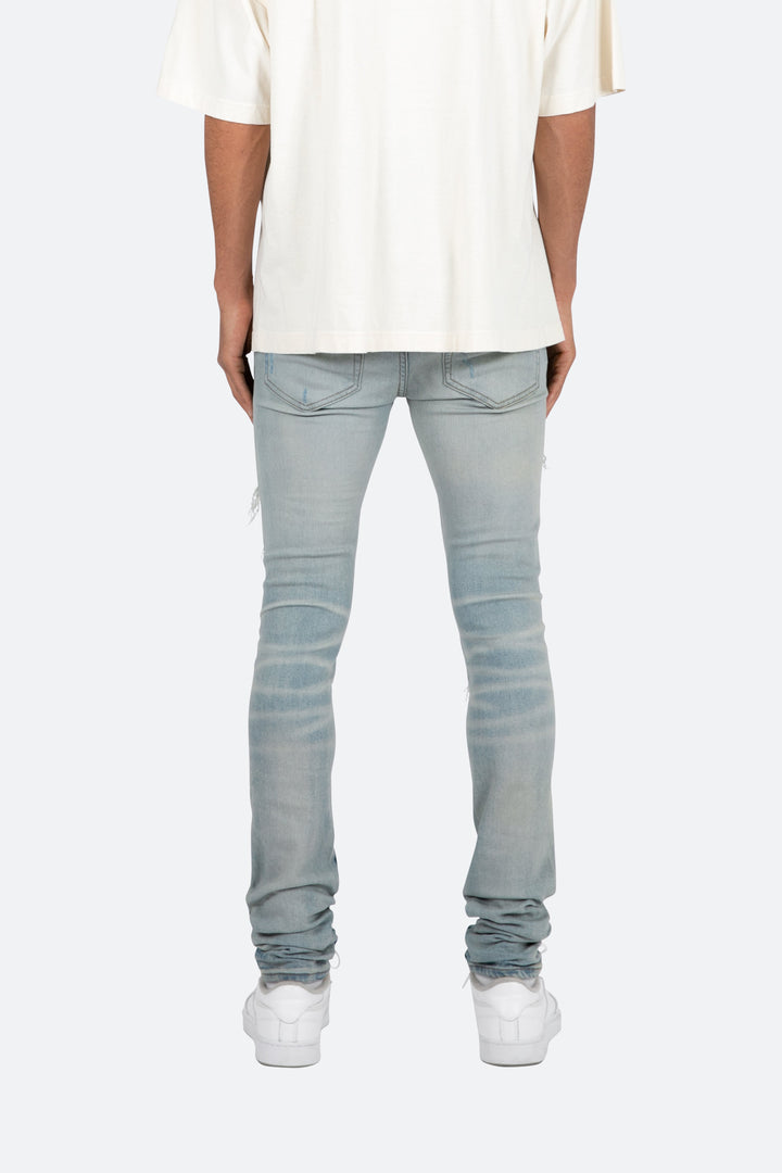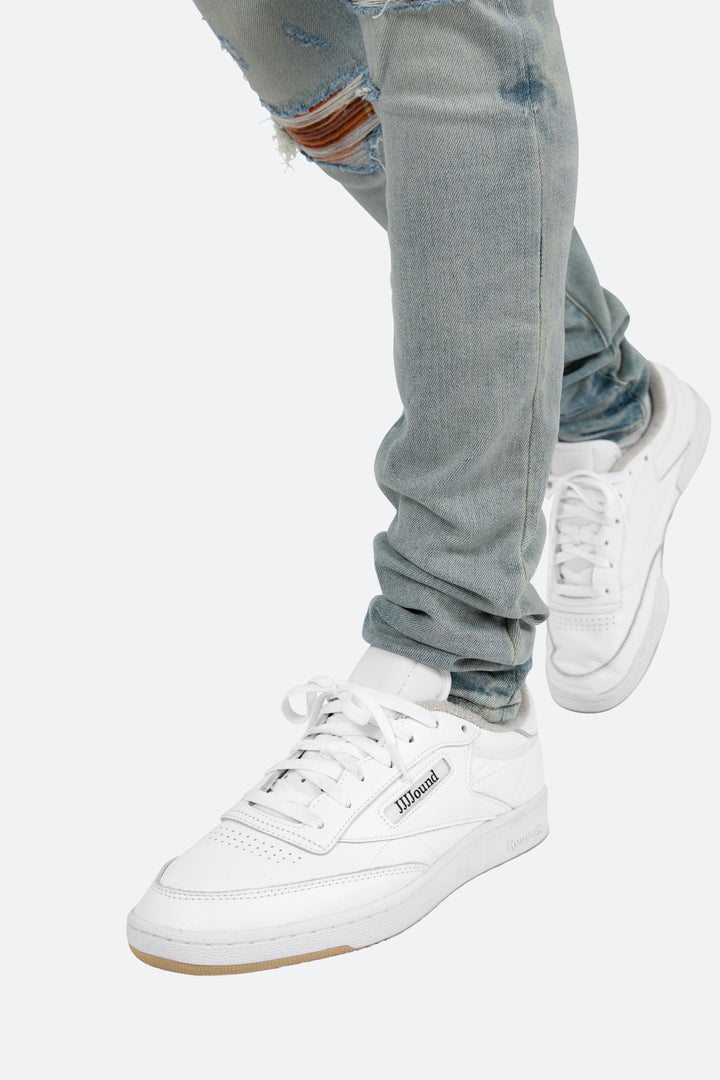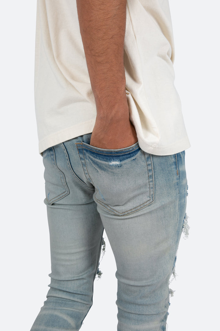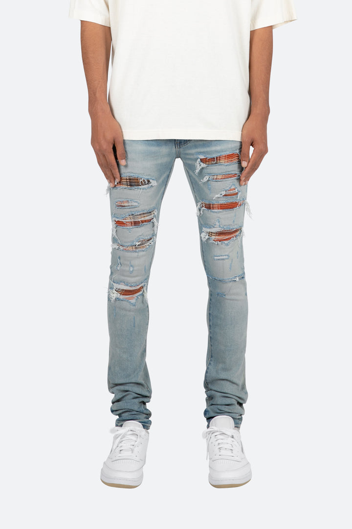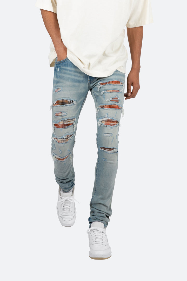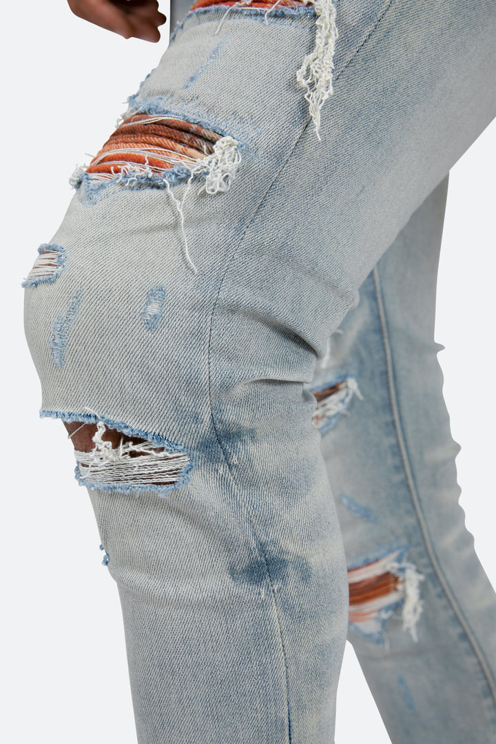 the X459 Stretch Denim is designed with our new X fit which is skinny throughout with an extended inseam for stacking, and features distressing throughout and finished with flannel repair panels at the holes at the knees and thigh.