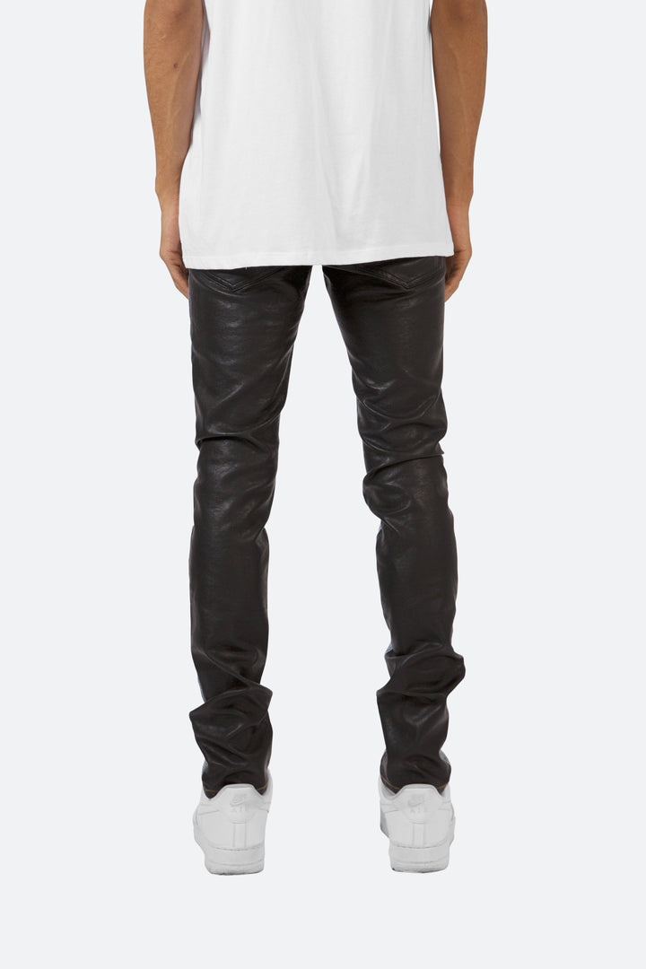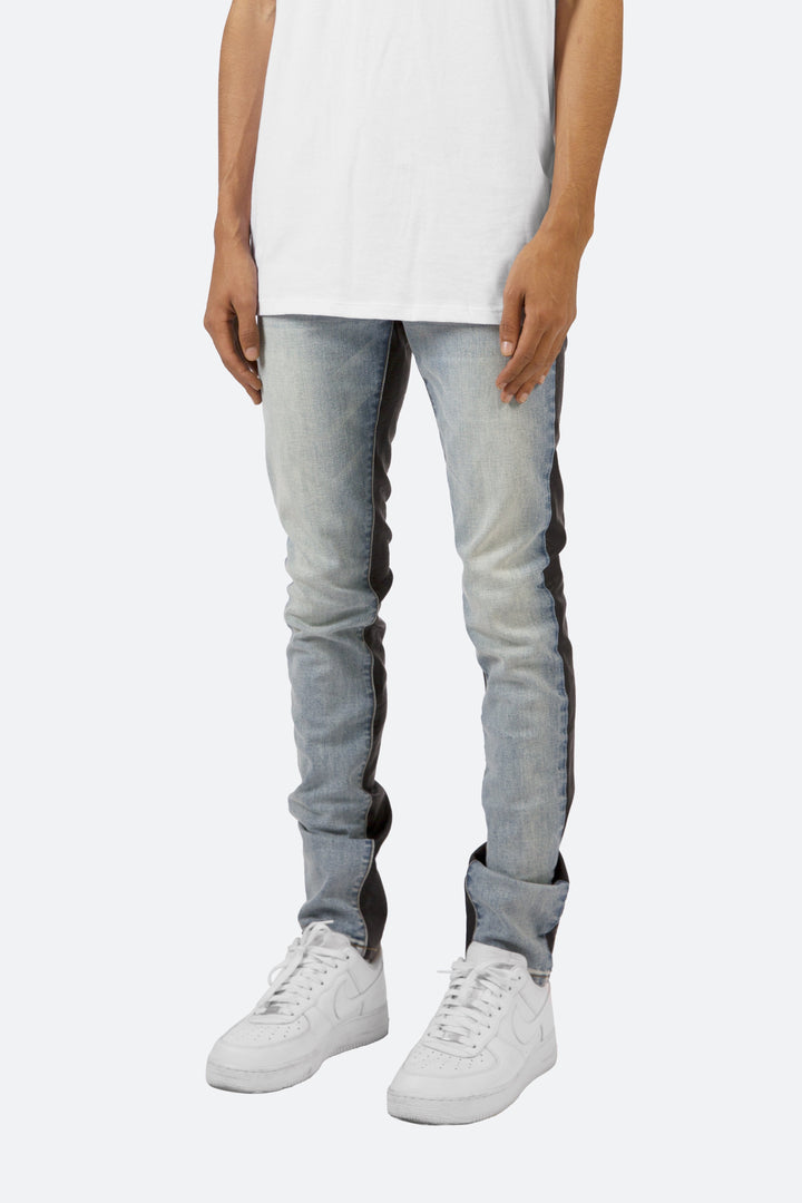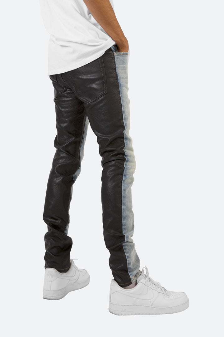 the X158 Stretch Denim is designed with our X fit which is skinny throughout, an extended inseam for stacking, and features a medium wash and whiskering on the front half and black poly-leather on the back half.