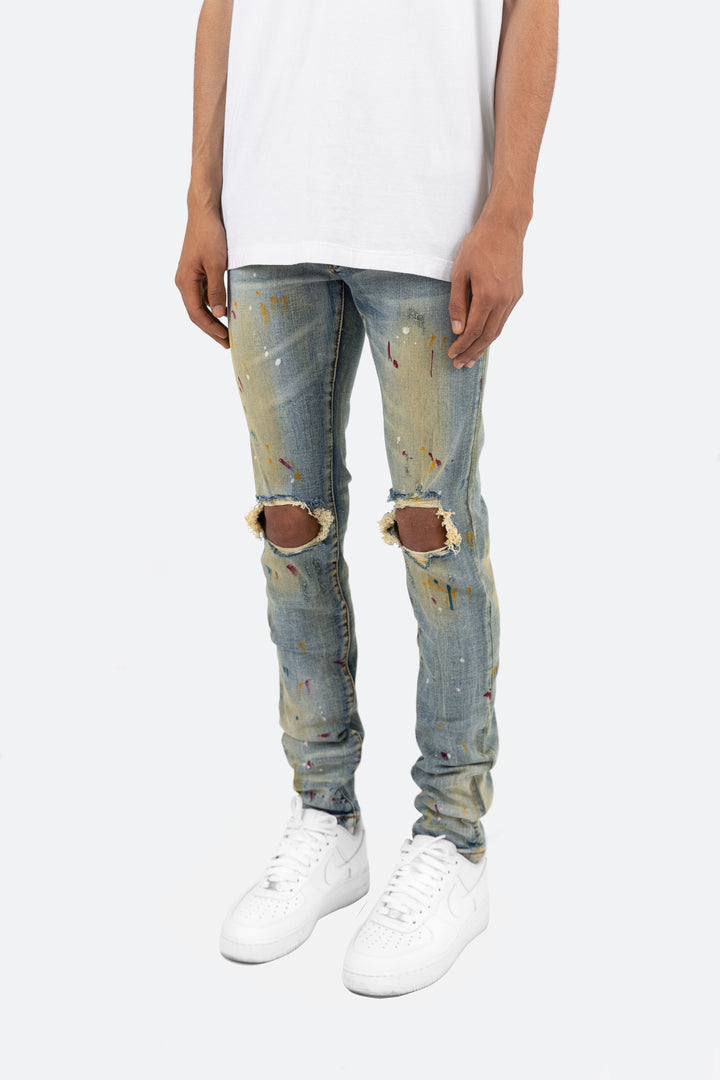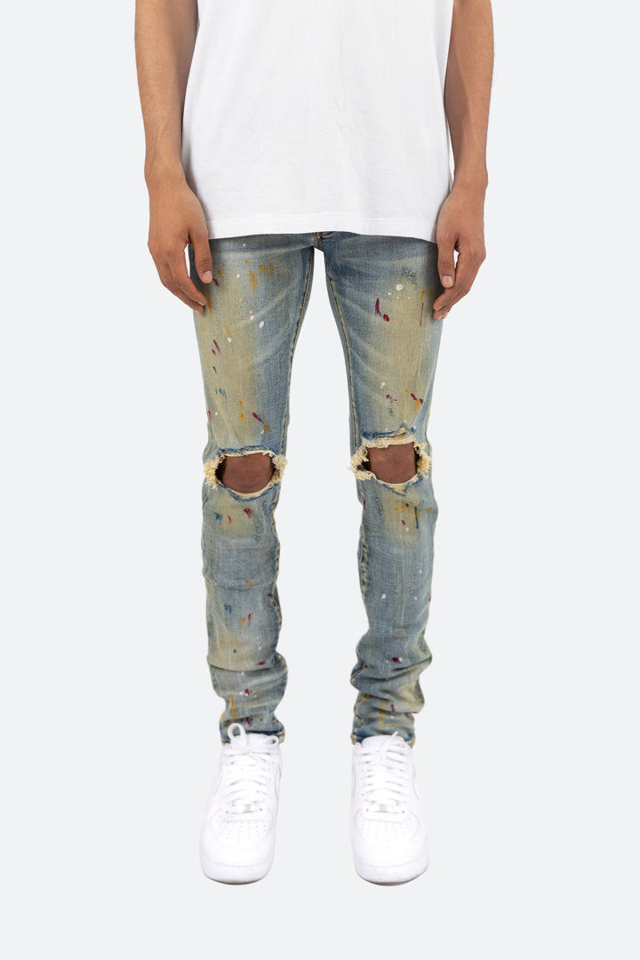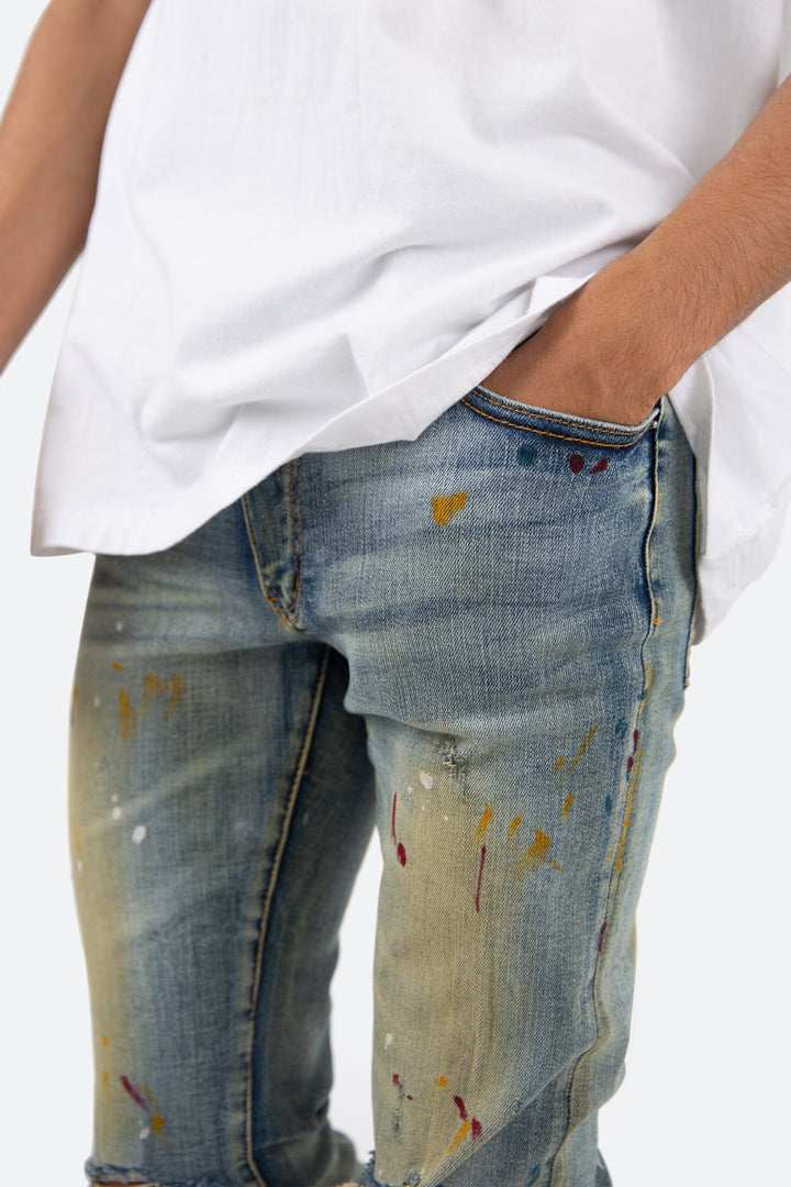 the X188 Stretch Denim is designed with our X fit which is skinny throughout, an extended inseam for stacking, and features a yellow tinted medium wash, multi-colored paint splatter details, and is finished with whiskering throughout.