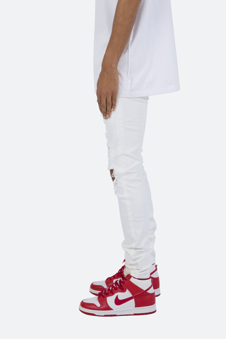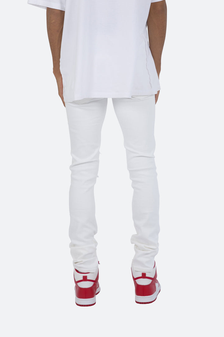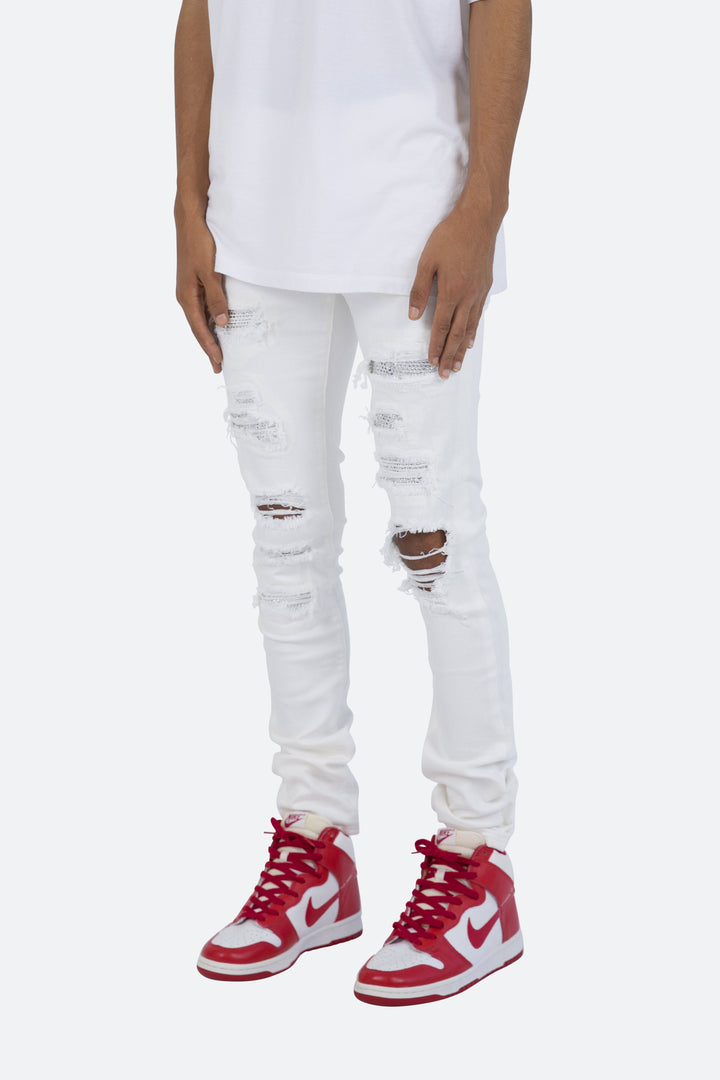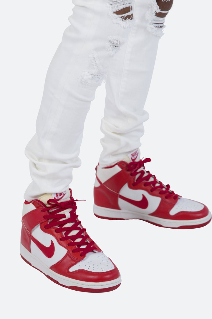the X201 Stretch Denim is designed with our new X fit which is skinny throughout with an extended inseam for stacking, and features distressing throughout, and finished with repair panels with rhinestones.