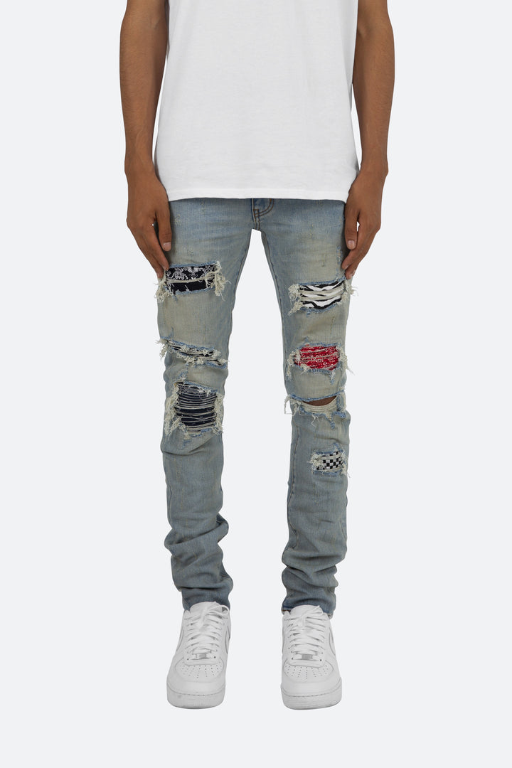 the X214 Stretch Denim is designed with our new X fit which is skinny throughout with an extended inseam for stacking, and features a medium wash, distressing throughout and finished with mixed printed fabric repairs in both the knees and thigh distressing.