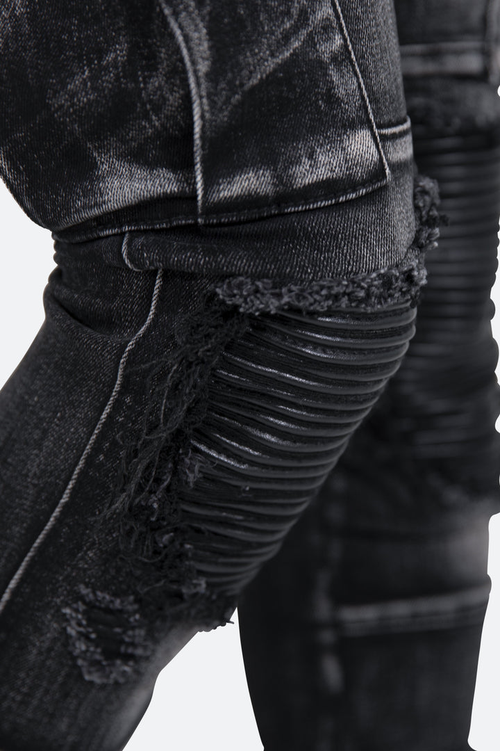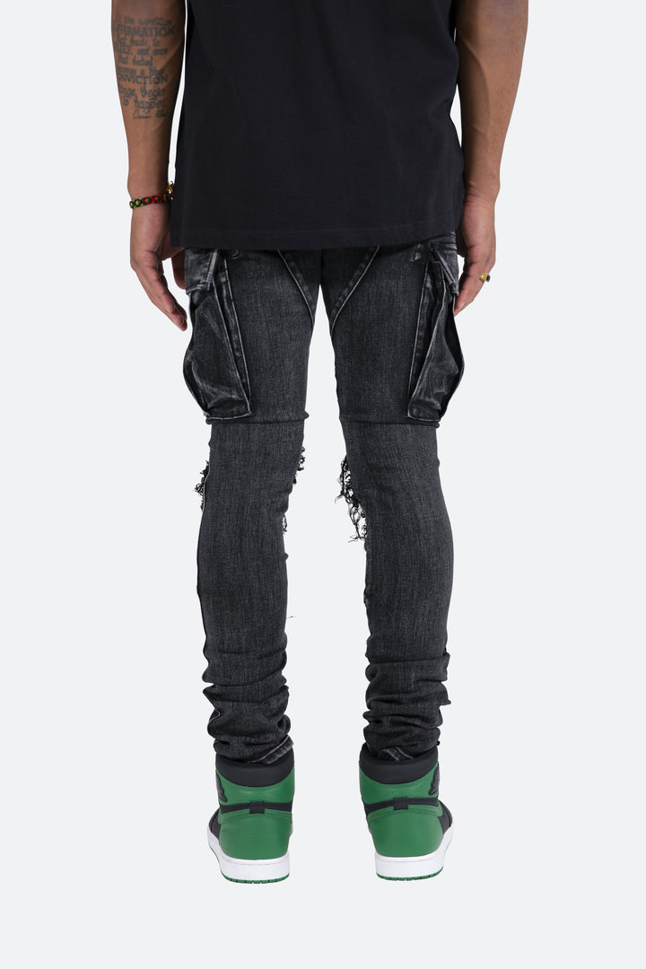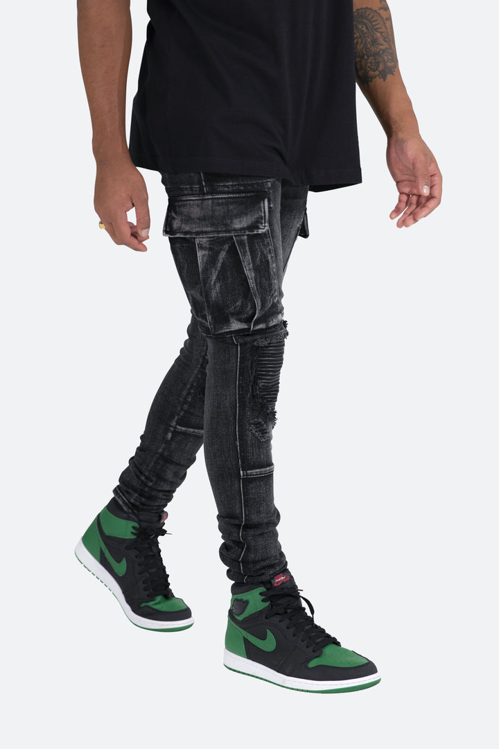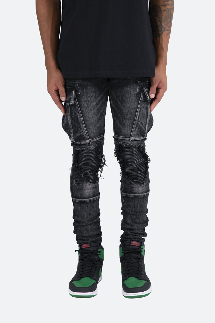 the X288 Stretch Cargo Denim is designed with our new X fit which is skinny throughout with an extended inseam for stacking, and features distressing throughout that are repaired with pin-tucked poly-leather panels repairing the holes at the knees and thigh, and finished with cargo pockets at the outseam.