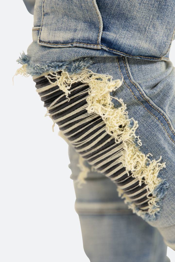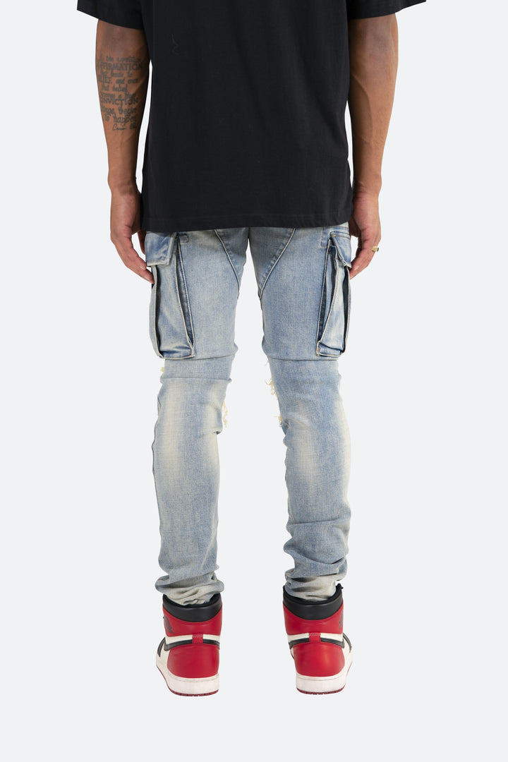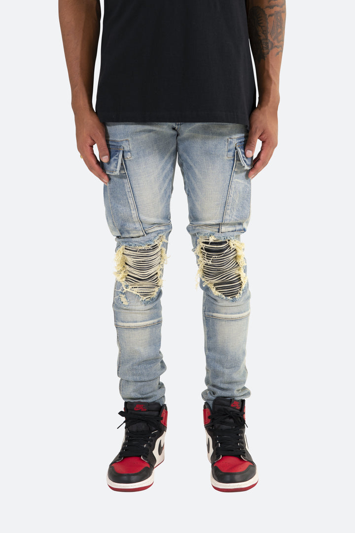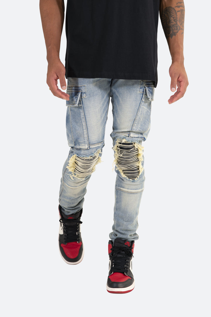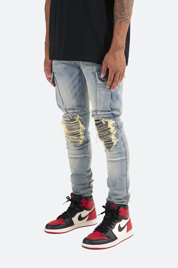 the X288 Stretch Cargo Denim is designed with our new X fit which is skinny throughout with an extended inseam for stacking, and features distressing throughout that are repaired with pin-tucked poly-leather panels repairing the holes at the knees and thigh, and finished with cargo pockets at the outseam.