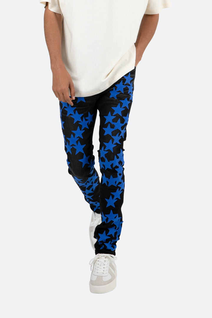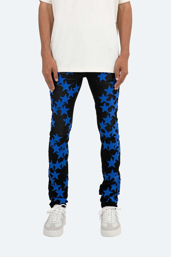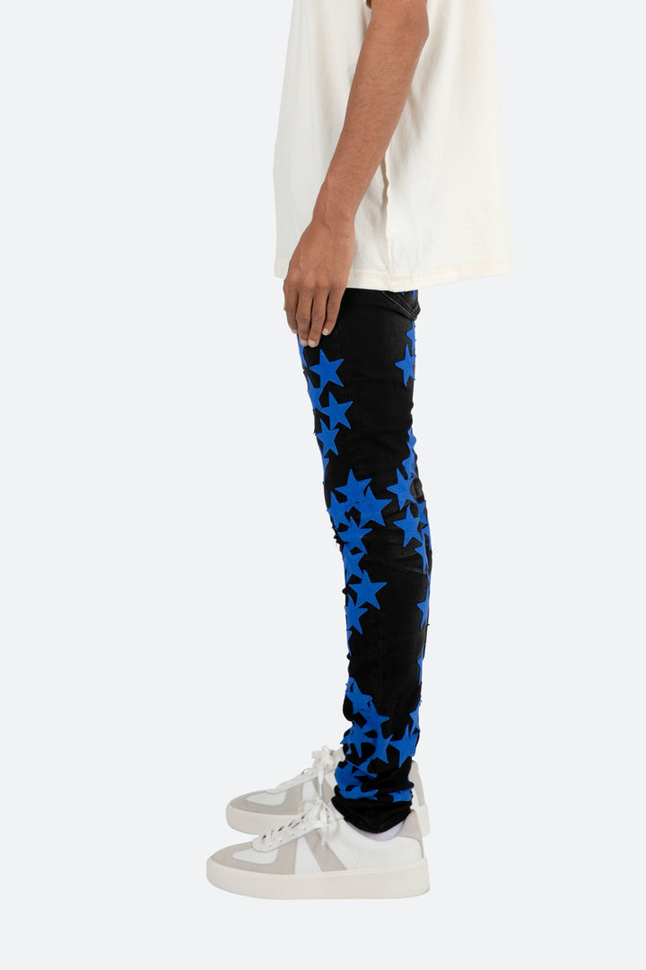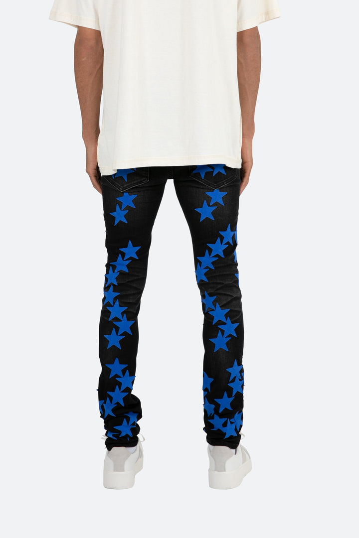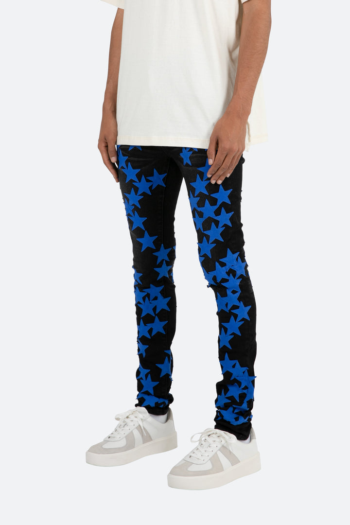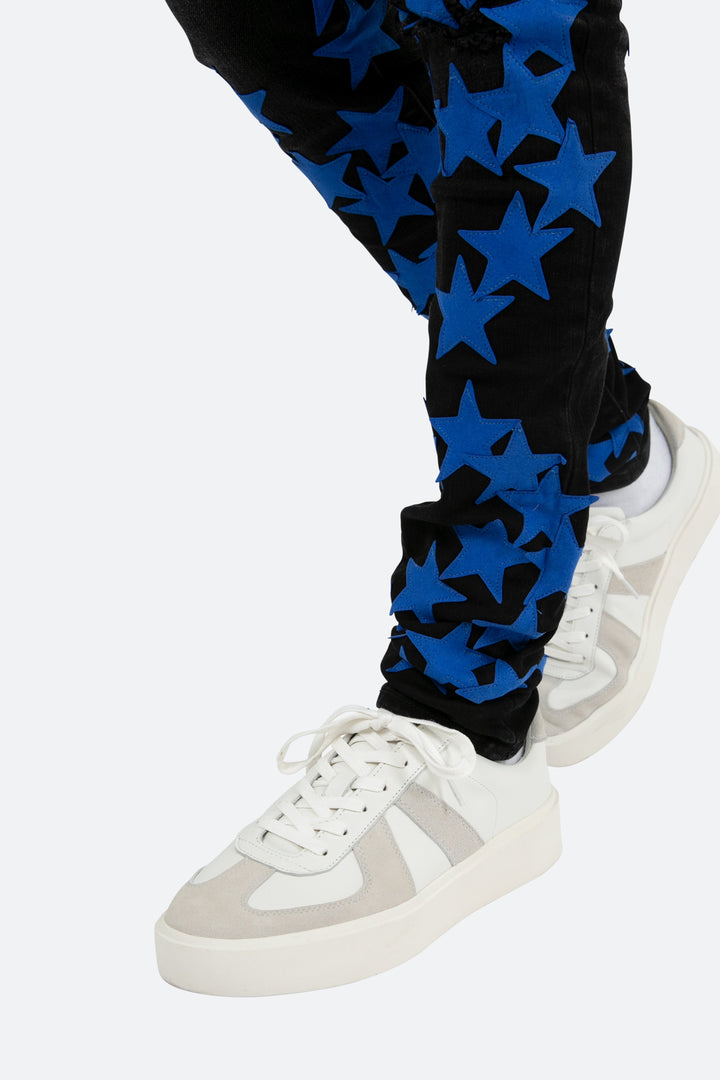 the X473 Stretch Star Denim is designed with our new X fit which is skinny throughout with an extended inseam for stacking, constructed from a rinsed black denim, and finished with faux suede blue star appliques throughout.